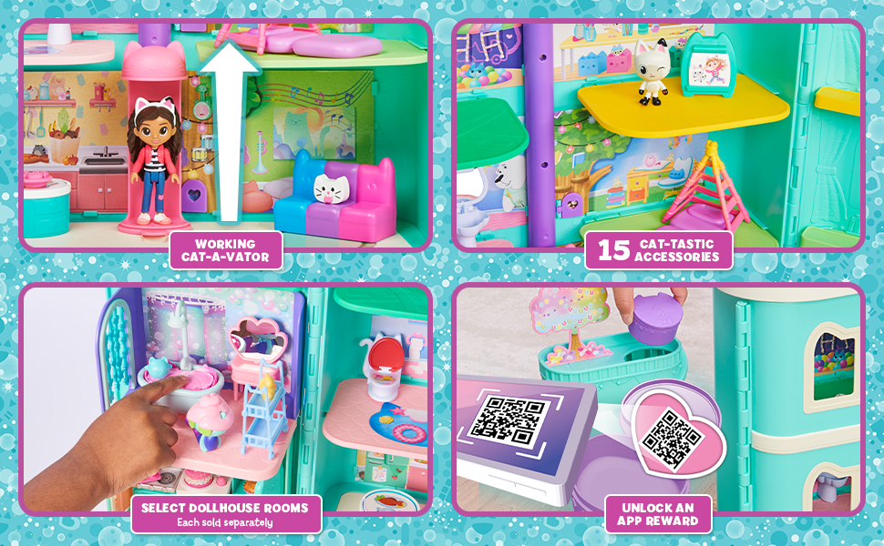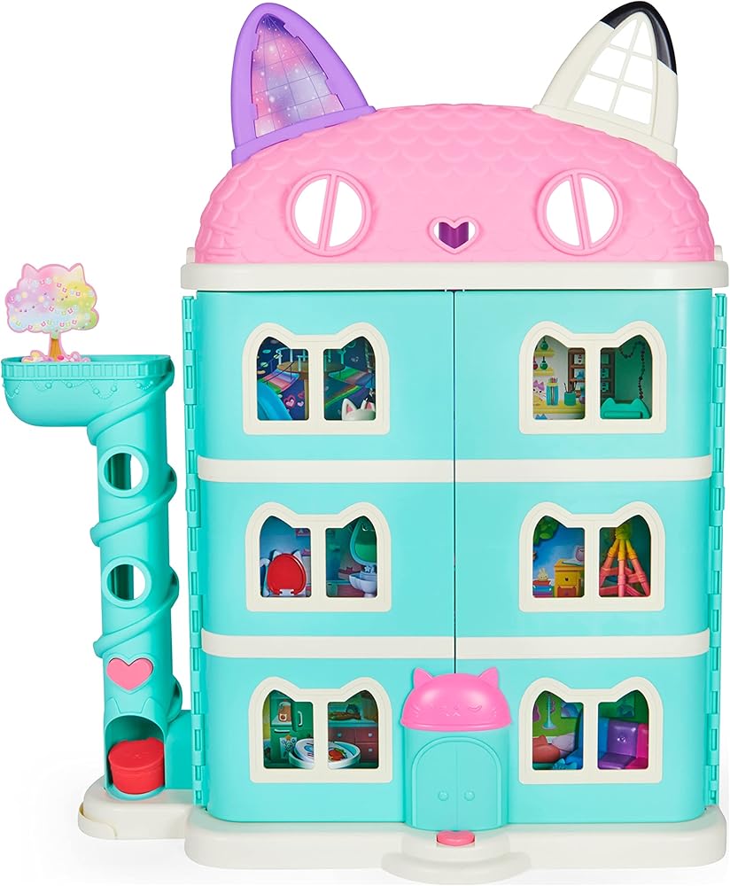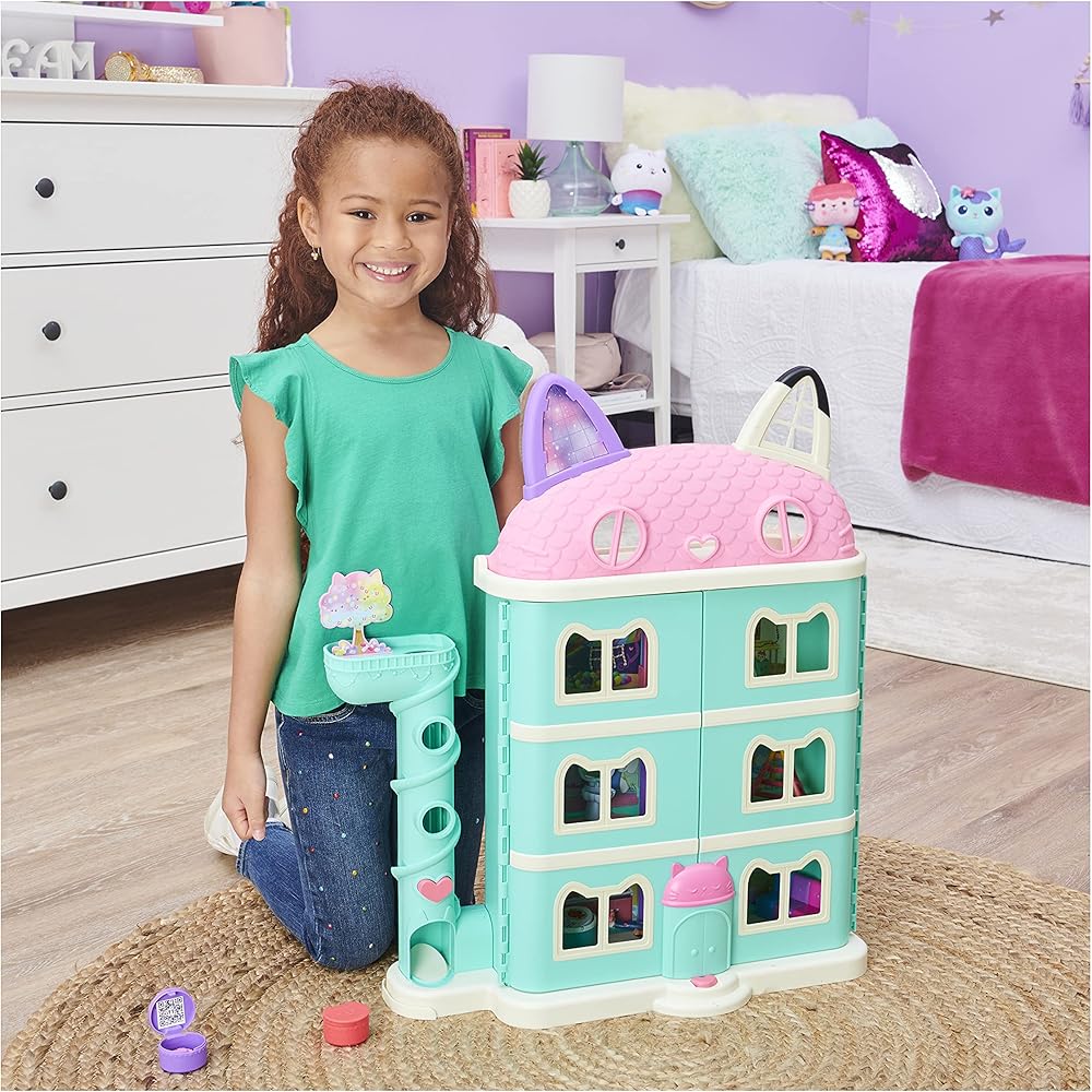 Play inside your own dollhouse world with Gabby's Dollhouse Purrfect Dollhouse! Standing over 2ft. tall, this fantastical kids dollhouse is packed with exciting features to discover, including a Dollhouse Delivery tower, working Cat-A-Vator, sounds and so much more! With a 3.5-inch Gabby Girl collectible figure, Pandy Paws figure, furniture for each room, three accessories and two Dollhouse Deliveries, you can get straight to the fun right out of the box. Just like in the show, drop a delivery in the tower and press the button to retrieve it – unbox it to find a surprise accessory inside! Open the dollhouse and press the button on the front to hear songs, sounds and phrases from the show! With so many rooms and surprises to explore, use your imagination to play out endless adventures with Gabby and her best pal Pandy Paws. Relax on the music room's colorful couch and open the door on the tree to reveal a guest on the room's backdrop. Hungry? Flip the table in the kitchen to turn it from breakfast to dinner! Take a ride in the Cat-A-Vator and slide it up to reach each floor. Help Gabby wash her hands at the bathroom sink or find a colorful surprise in the toilet; let Pandy Paws get some rest under the play tent in the bedroom; get creative on the craft room's easel and have fun on the playroom's slide. When you reach the top floor, flip the roof back and play in the attic! Add more rooms to your toy house with the Deluxe Rooms (each sold separately) – slide the rooms directly into the dollhouse's walls! For easy storage after a fun-filled day of pretend play, Gabby's Purrfect Dollhouse can close up with or without the Deluxe Rooms inside. This dollhouse is the ultimate gift for kids aged 3 and up. For one last surprise, scan the QR code inside one of the Dollhouse Deliveries to unlock a special reward in the free Gabby's Dollhouse App (available on iOS and Android). Bring the magic of Gabby's Dollhouse to life with Gabby's Purrfect Dollhouse!