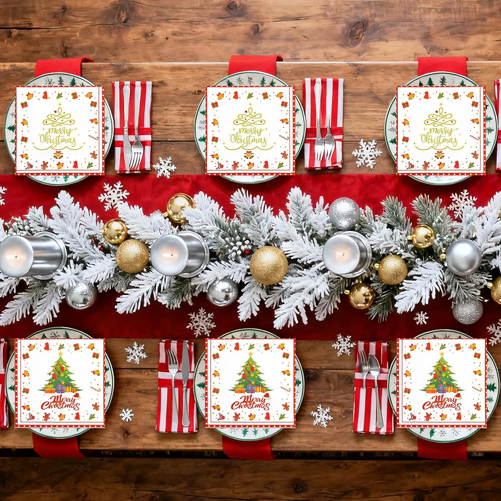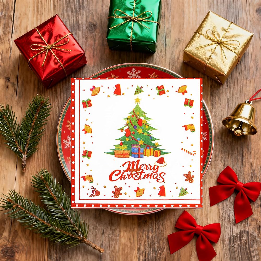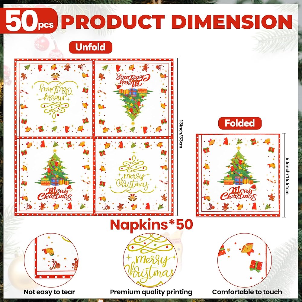 50 قطعة من المناديل الورقية لعيد الميلاد المجيد - مناديل غداء شجرة عيد الميلاد مقاس 6.5 × 6.5 بوصة، مناديل عشاء مزدوجة الجوانب للاستخدام مرة واحدة لتزيين حفلات عيد الميلاد وعيد الميلاد