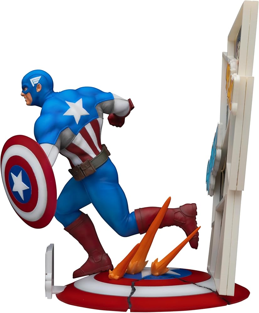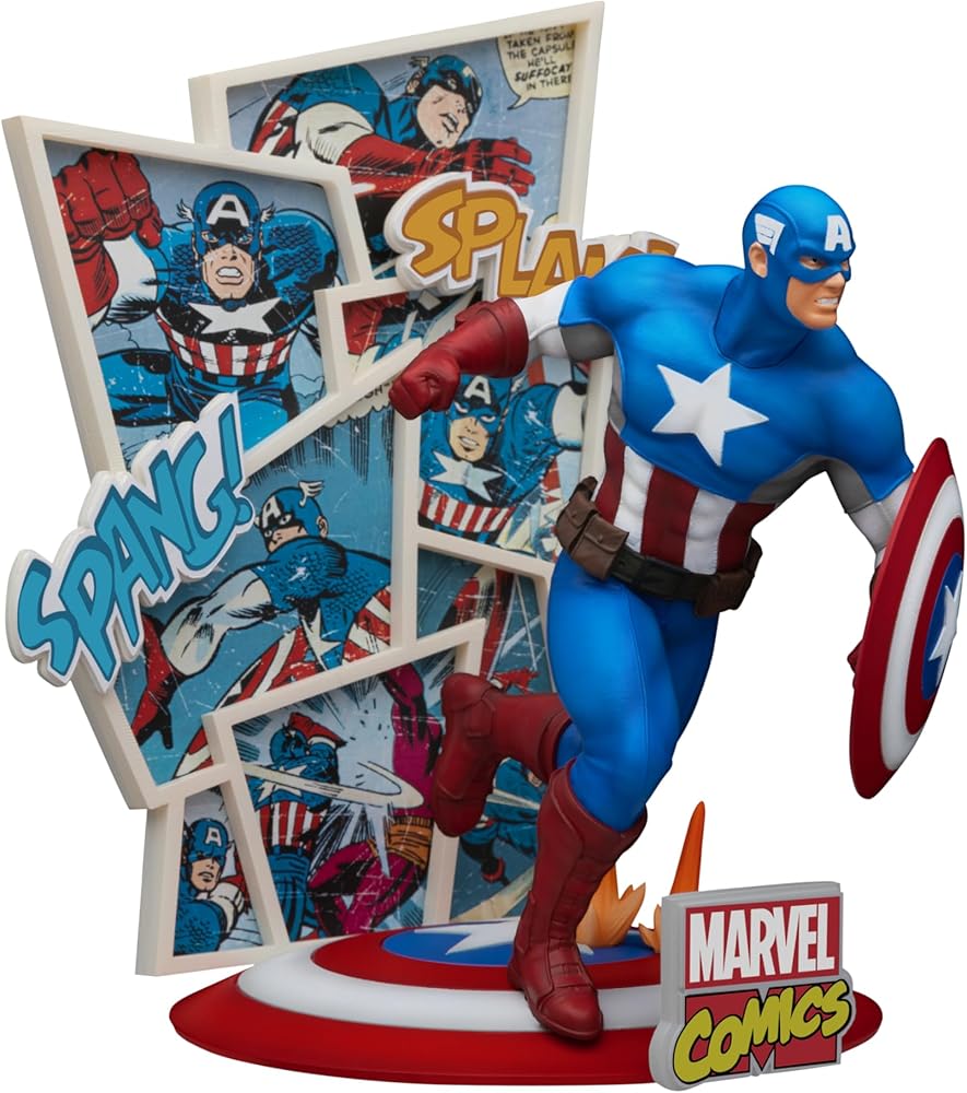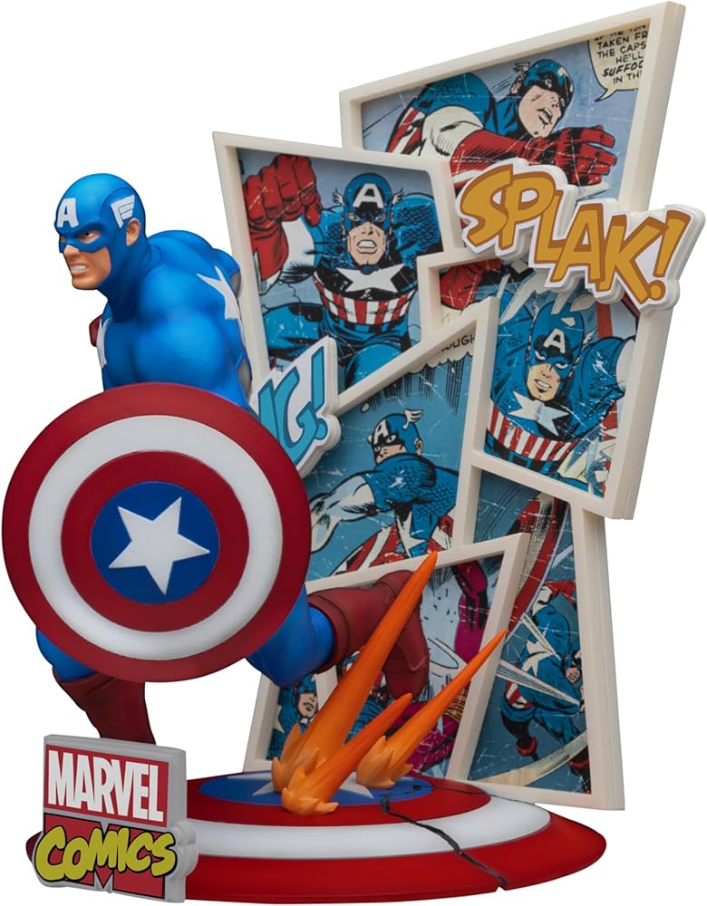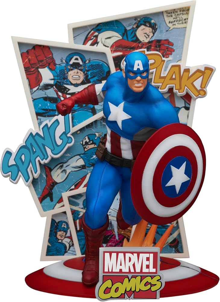 From Beast Kingdom. A PREVIEWS Exclusive! Celebrate 60 years of Marvel Comics with these amazing new figurines from Beast Kingdom! The D-Stage "Staging Your Dreams" series launches a new collection of Marvel Comics figurines in celebration of Marvel's 60th-anniversary, featuring two iconic characters: Iron Man and Captain America. This Captain America figurine is rendered in a comic book-accurate style, with comic panel backgrounds and exciting typography straight from the classic comic book pages. The base showcases a distinctive object representing the patriotic hero, namely Captain America's star-adorned shield. With meticulous coloring techniques and detailed character scenes, these figurines are a must-have collectible for Marvel fans of all ages and the perfect way to show your love for Marvel Comics. Iron Man and Captain America sold separately. Collect them both!