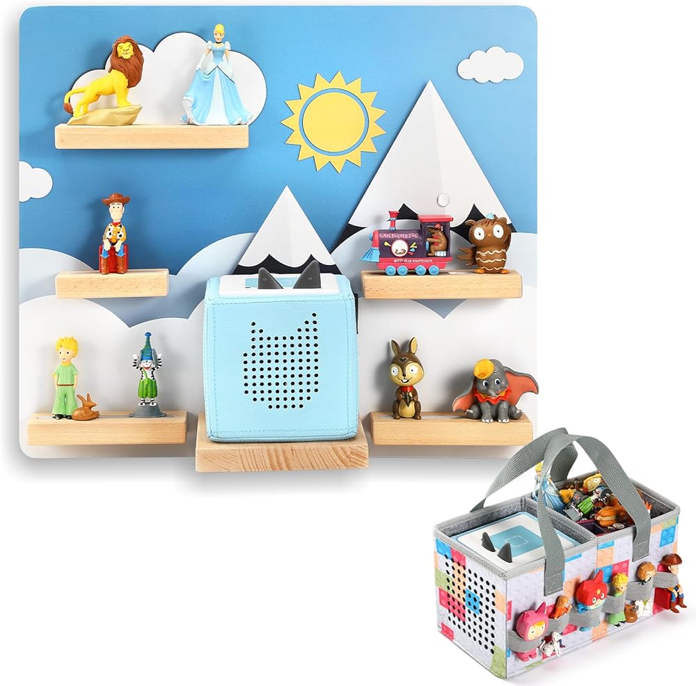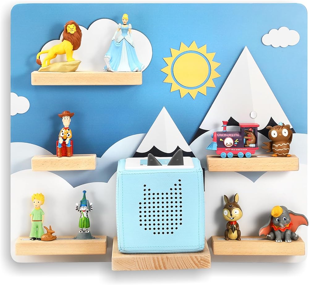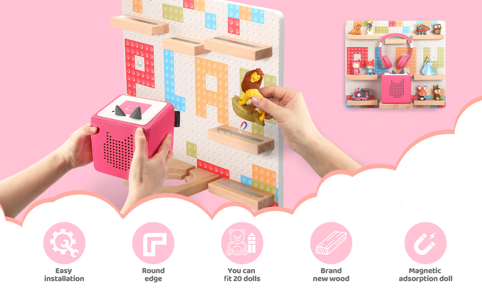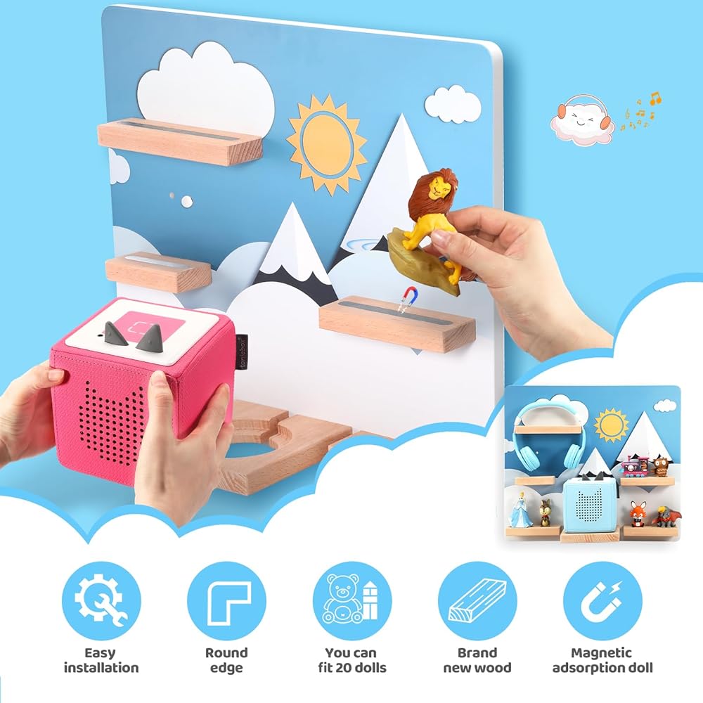 【سعة كبيرة】رف Toniebox يمكن أن يعمل مع شخصيات Tonie كما أنه عملي أيضًا لـ Toniebox ومحطة الشحن. بفضل الأشرطة المغناطيسية المدمجة في الخشب، يتم تثبيت كل شيء بشكل آمن.