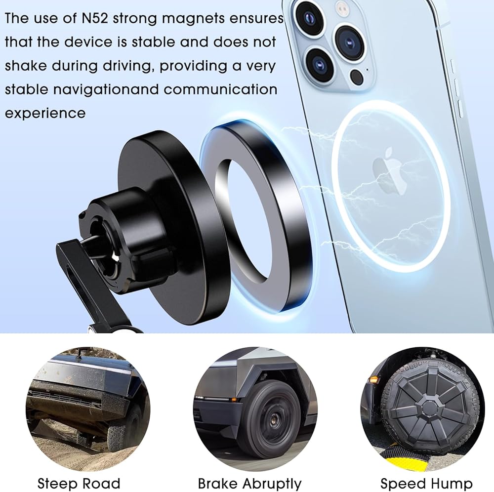 Strong magnetic design: Adopts N52 strong magnets to ensure that your iPhone or other MagSafe-enabled devices are stable and not shaken during driving, which is very suitable for Tesla Cybertruck 2024. Provide a stable navigation and communication experience.