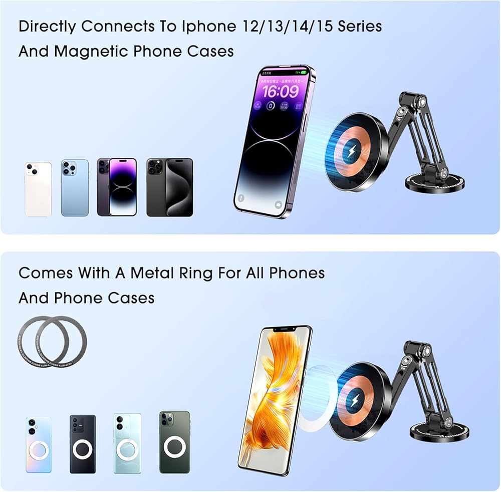 15W wireless fast charging: This Cybertruck 2024 magnetic wireless charging mobile phone holder supports up to 15W fast wireless charging, suitable for iPhone 14/13/12 series and other devices that support wireless charging, with overvoltage, short circuit and overcurrent protection to ensure charging safety.