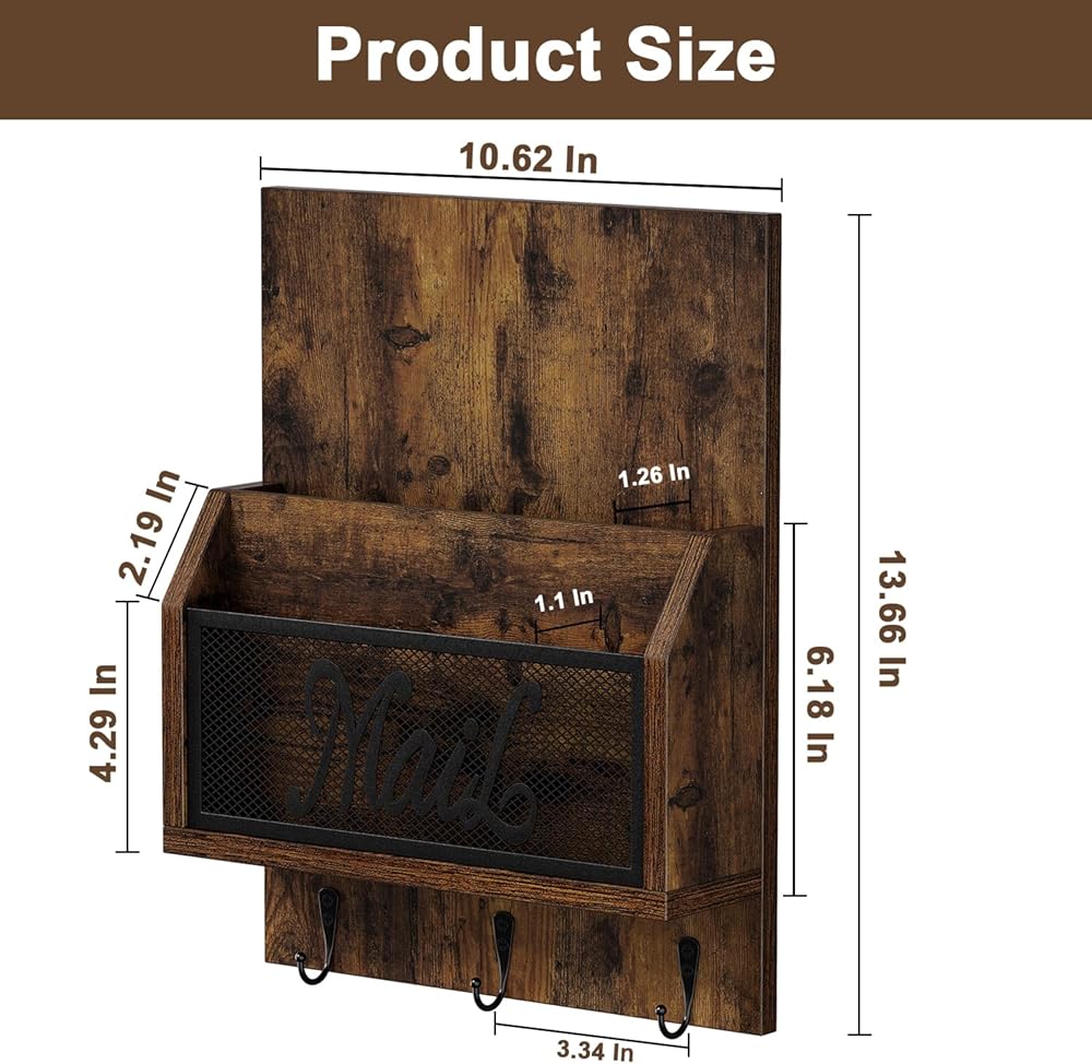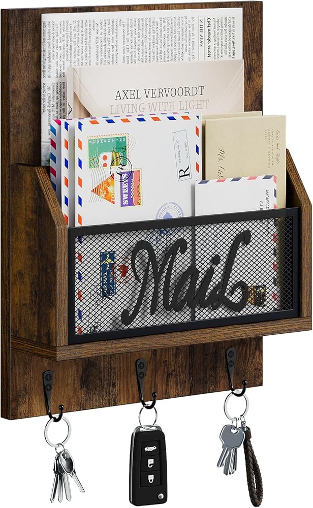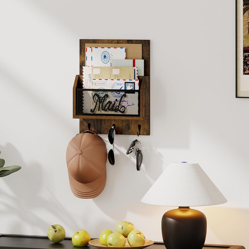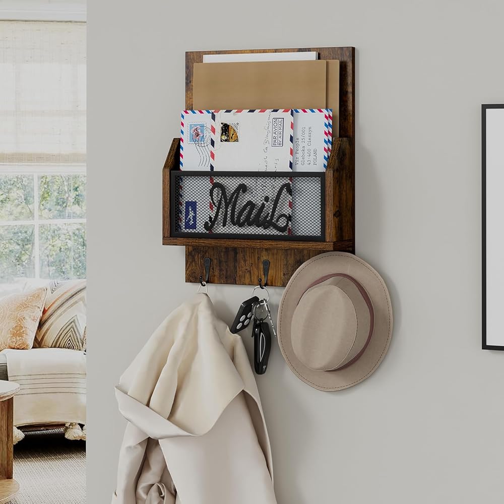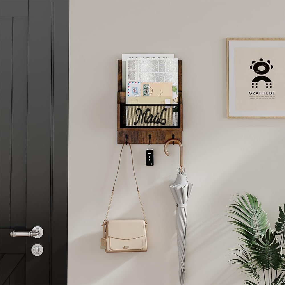 بريد متعدد الوظائف وحامل مفاتيح: مزود بفتحتين للبريد لفرز الحروف والمجلات والصحف، بالإضافة إلى 3 خطافات متينة لتعليق المفاتيح أو النظارات الشمسية أو سلاسل الكلاب أو المظلات. هذا الحائط الذي يفرز البريد يجعل من السهل الحفاظ على مستلزماتك اليومية الأساسيات في متناول اليد ويلغي الحاجة للبحث عن العناصر في غير محلها.