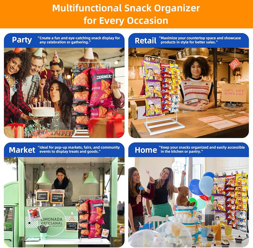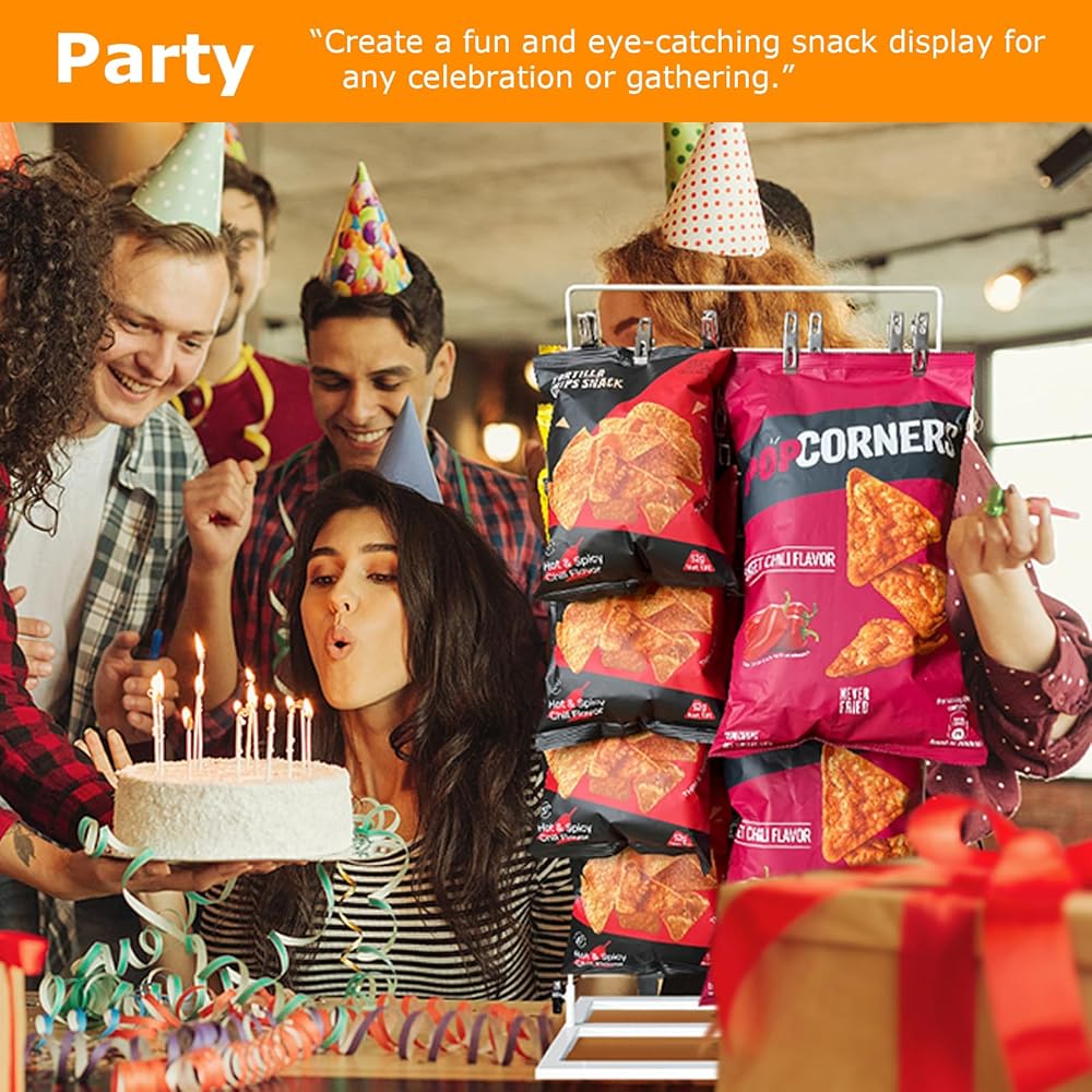 متعدد الاستخدامات في المناسبات: مثالي لتنظيم الوجبات الخفيفة والحلوى والمكافآت، حامل الرقائق هذا رائع للحفلات والمناسبات، حيث يعمل كحامل لحقيبة الرقائق ومنظم للرقائق لتخزين المؤن، مما يحافظ على كل شيء في متناول اليد.