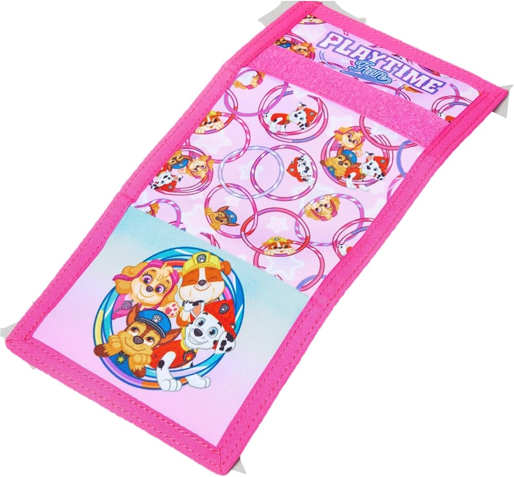 Paw Patrol kids' tri-fold pink wallet with storage for cards, notes and coins. Officially licensed Paw Patrol wallet. Pink synthetic wallet with pink trim and multicoloured images of characters Chase, Marshall, Skye and Rubble on the front, and various images on the back. The wallet has a touch-and-close riptape fastening - it opens up to reveal a transparent card holder (suitable for a small bus pass or bank card), plus a place for notes to go. There is also a useful zipped compartment suitable for coins. Wallet measures 13 cm x 9 cm when folded. This practical wallet would be great as a gift for any Paw Patrol fan