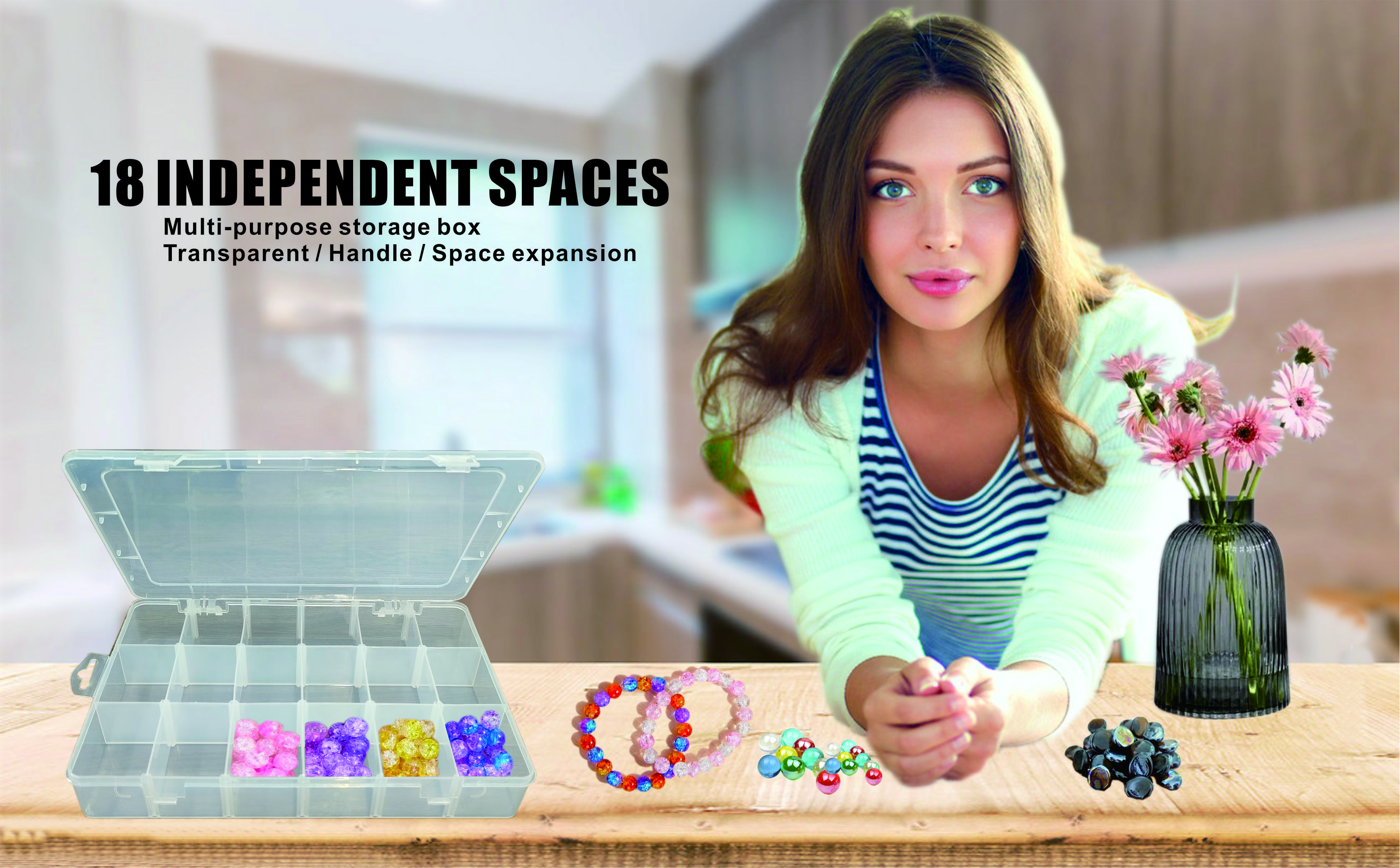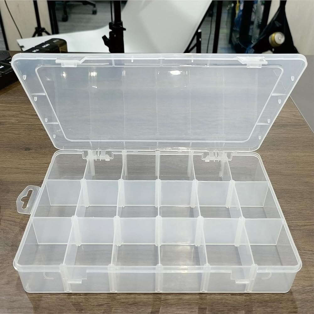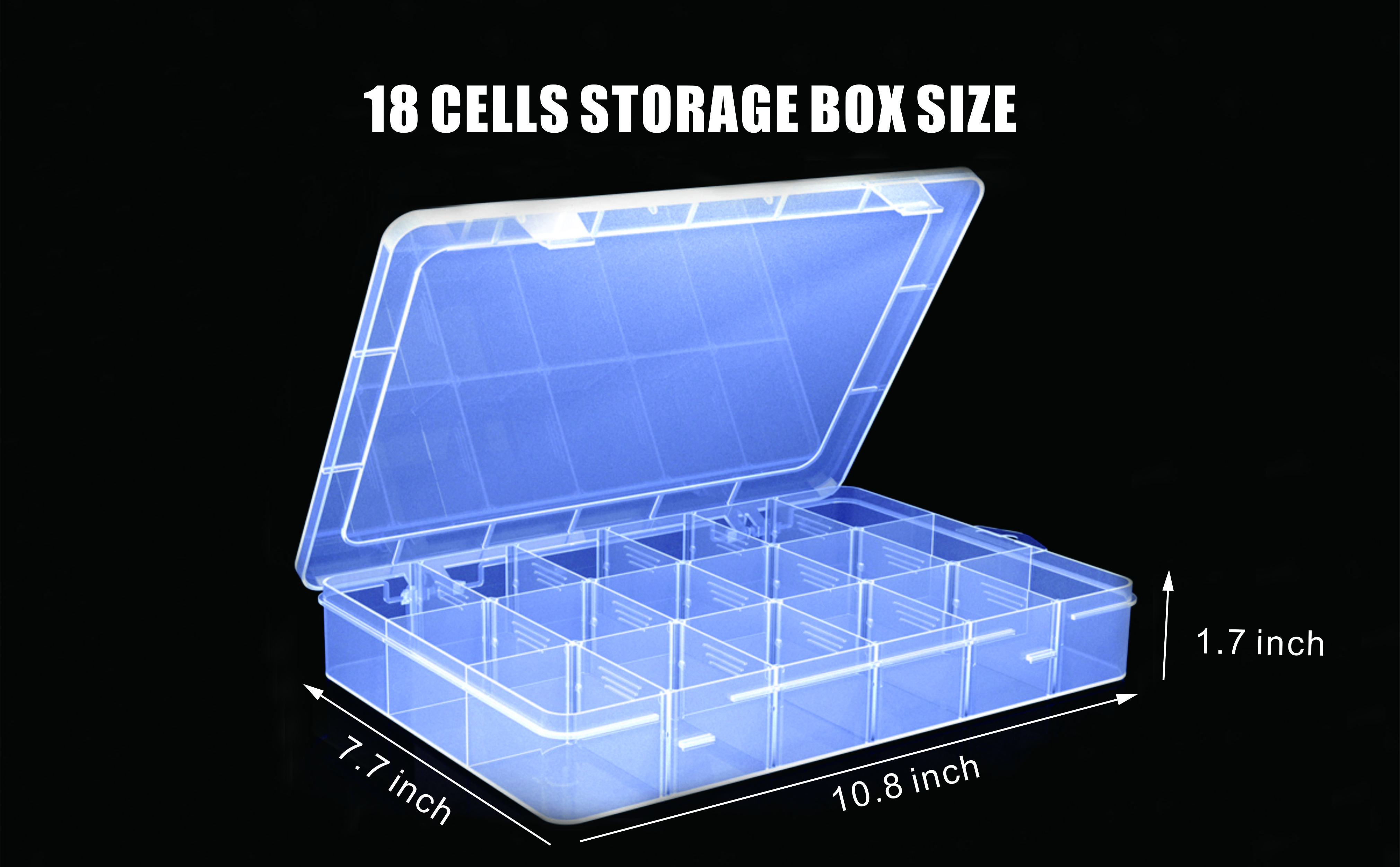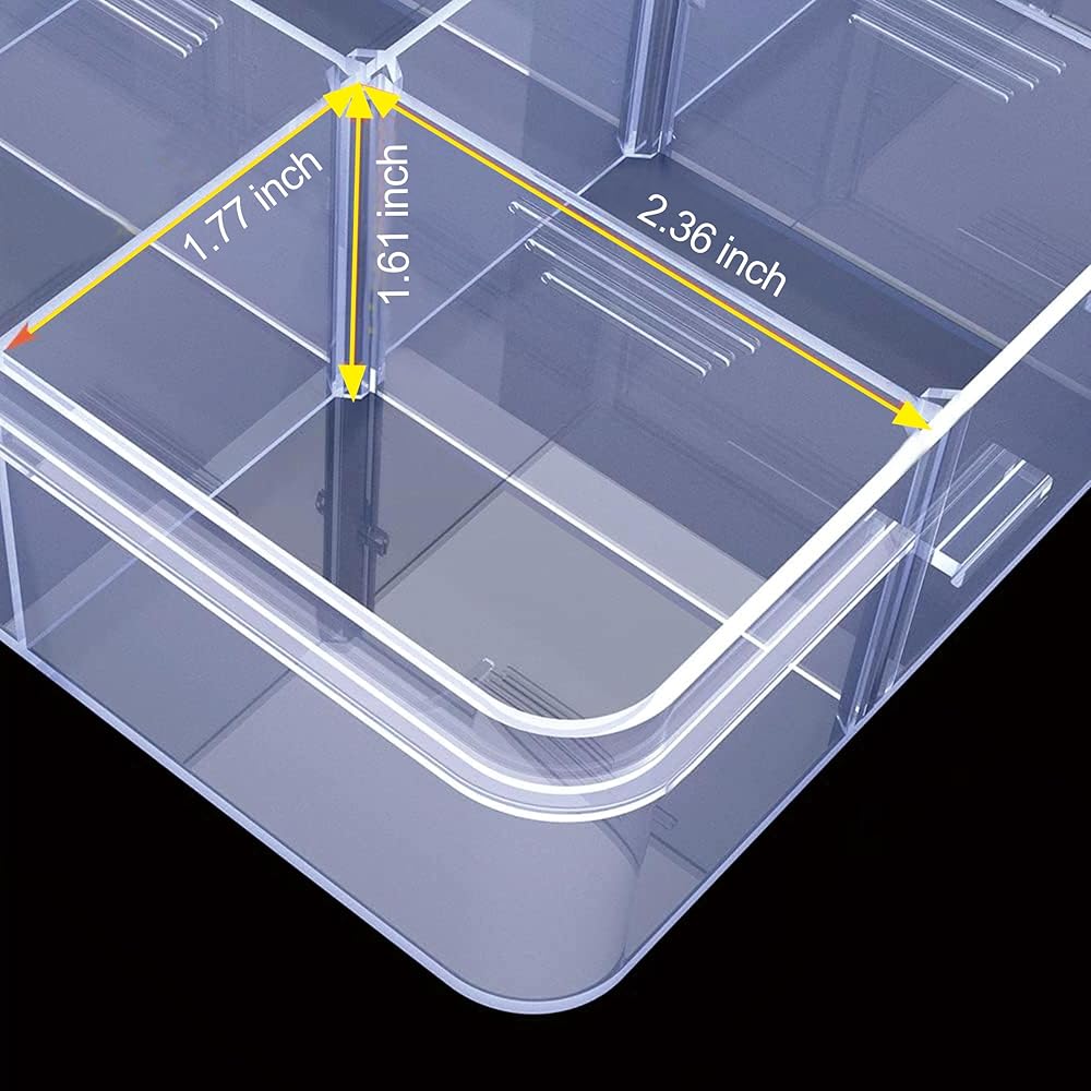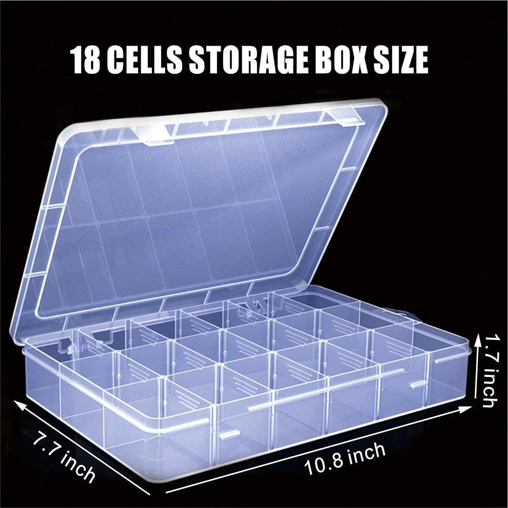 [سعة كبيرة وأقسام قابلة للإزالة]: صناديق تخزين كبيرة شفافة تخزن كل شيء صغير، من المجوهرات إلى الحرف اليدوية، وتقسيمها بسهولة مع الحفاظ عليها آمنة من الآفات والغبار. يمكن تعديل الشبكات الـ 18 الموجودة في الصندوق لتلبية احتياجات الأحجام المختلفة.