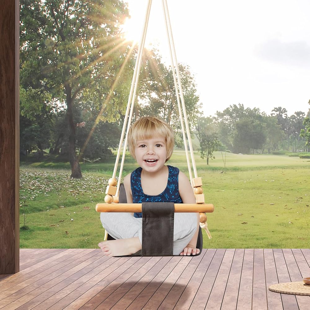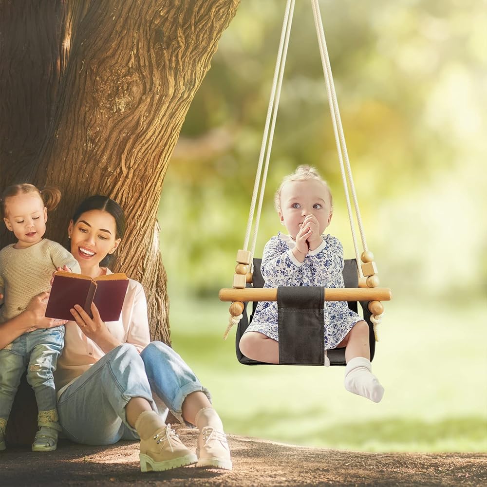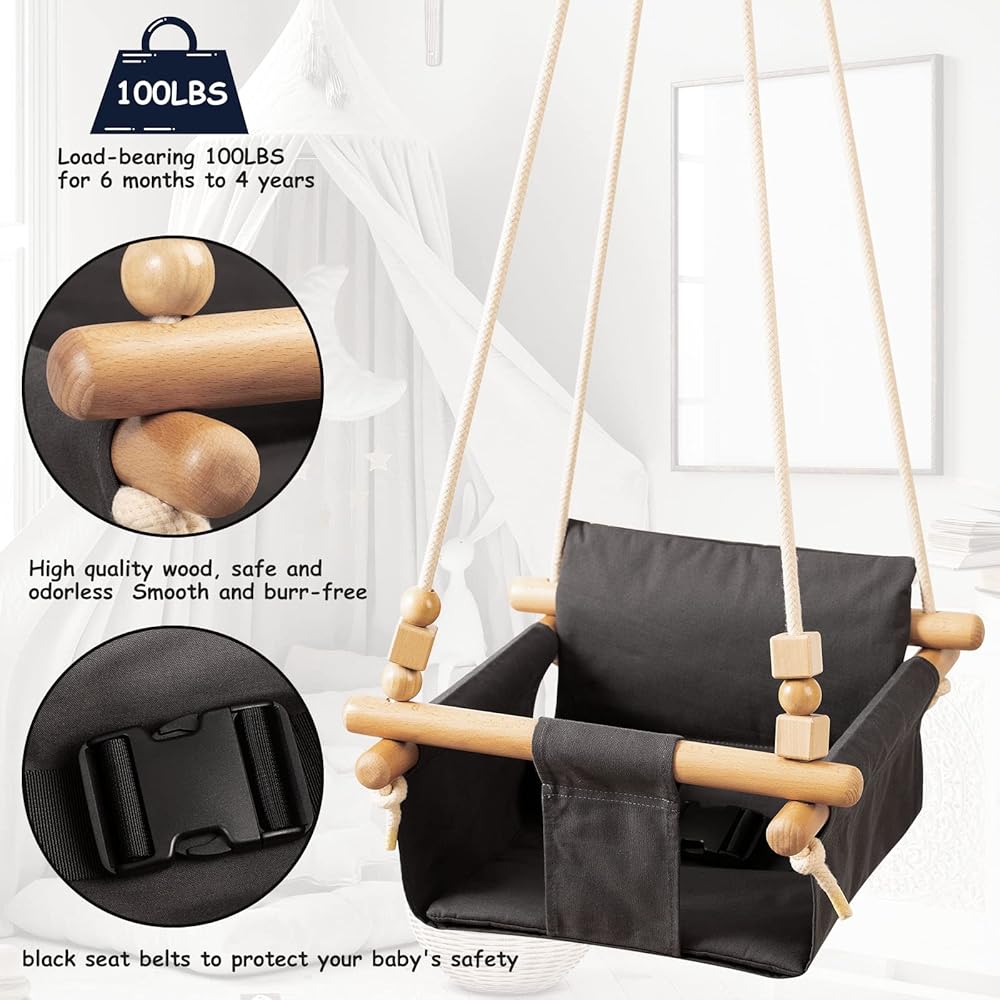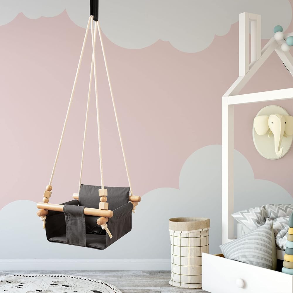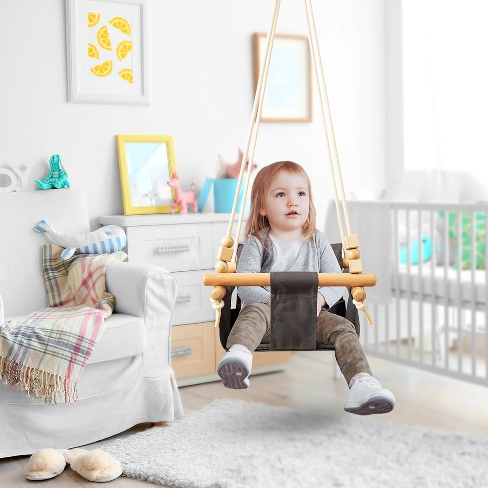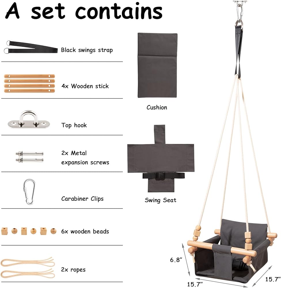 المادة--يتميز مقعدنا المتأرجح بقماش ناعم، ووسائد مع حشو بوليستر صديق للبشرة مما يوفر المزيد من الراحة والدعم لطفلك الصغير. يستخدم إطار أرجوحة الأطفال المعلقة خشب زان طبيعي عالي الجودة، ناعم.