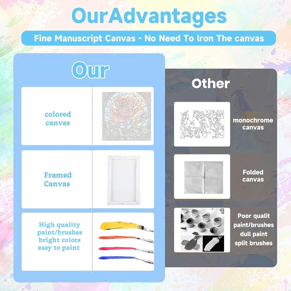 قماش احترافي وفرش عالية الجودة - يستخدم الطلاء بالأرقام قماشًا ملونًا عالي الدقة، مما يجعل من السهل التمييز بين منطقة الأرقام، ولا يسهل إرهاق العيون عند الرسم لفترة طويلة. من فضلك لا تقلق. الفرش عالية الجودة بأحجام مختلفة ليس من السهل تساقطها أو تقسيمها. يمكن أن يوفر لك مساعدة أكثر تفصيلاً لإنشاء أعمال أكثر حيوية وواقعية.