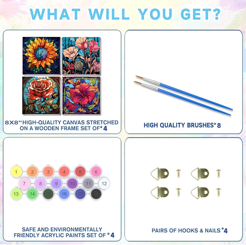 سوف تحصل على مجموعة الطلاء بالأرقام تتضمن قماشًا مطبوعًا مسبقًا (بدون إطار)*6، مجموعة طلاء أكريليك*6، مجموعة فرش عالية الجودة*6، دليل صور ملون*6، خطافات معدنية*12.