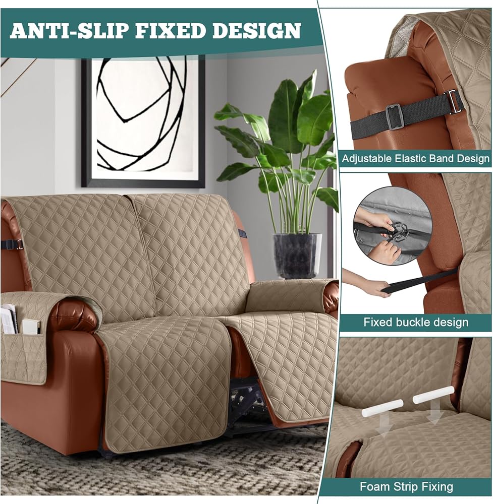 • Solid round colloid design on the back of our recliner cover to reduce slipping. Elastic straps on the top secure the back of the sofa. Elastic straps on the back with round buckles enhance slip resistance.