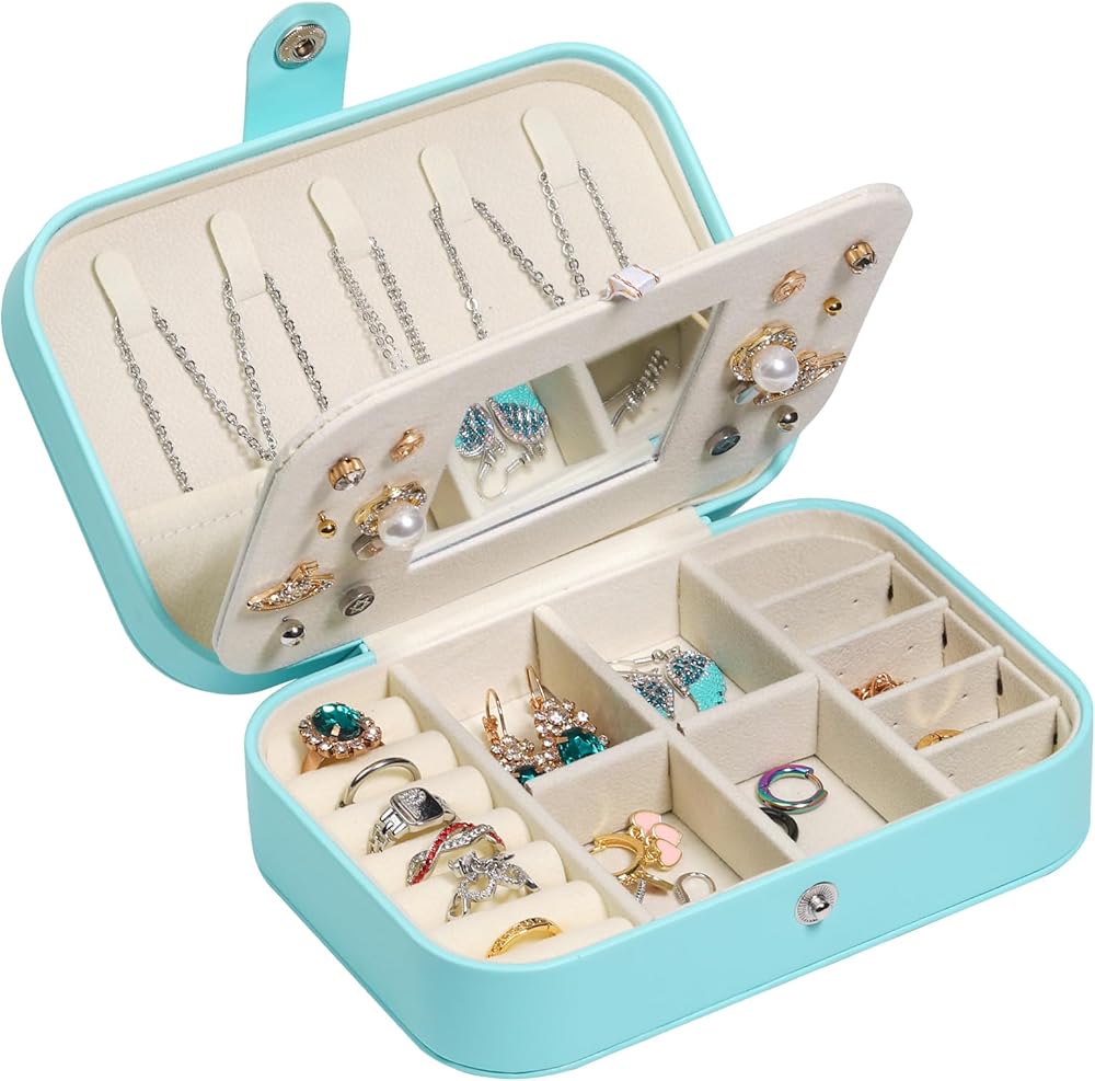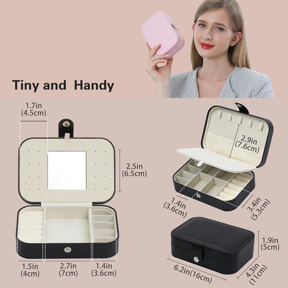 • Ideal jewelry box - size 6.2*4.3*1.9 inches, small size but large capacity Double-layer structure, with 5 hooks on the top to place necklaces, a mirror in the middle and 16 holes for earrings and studs, 6 ring holes at the bottom and 6 compartments for brooches, lipsticks, watches, etc.