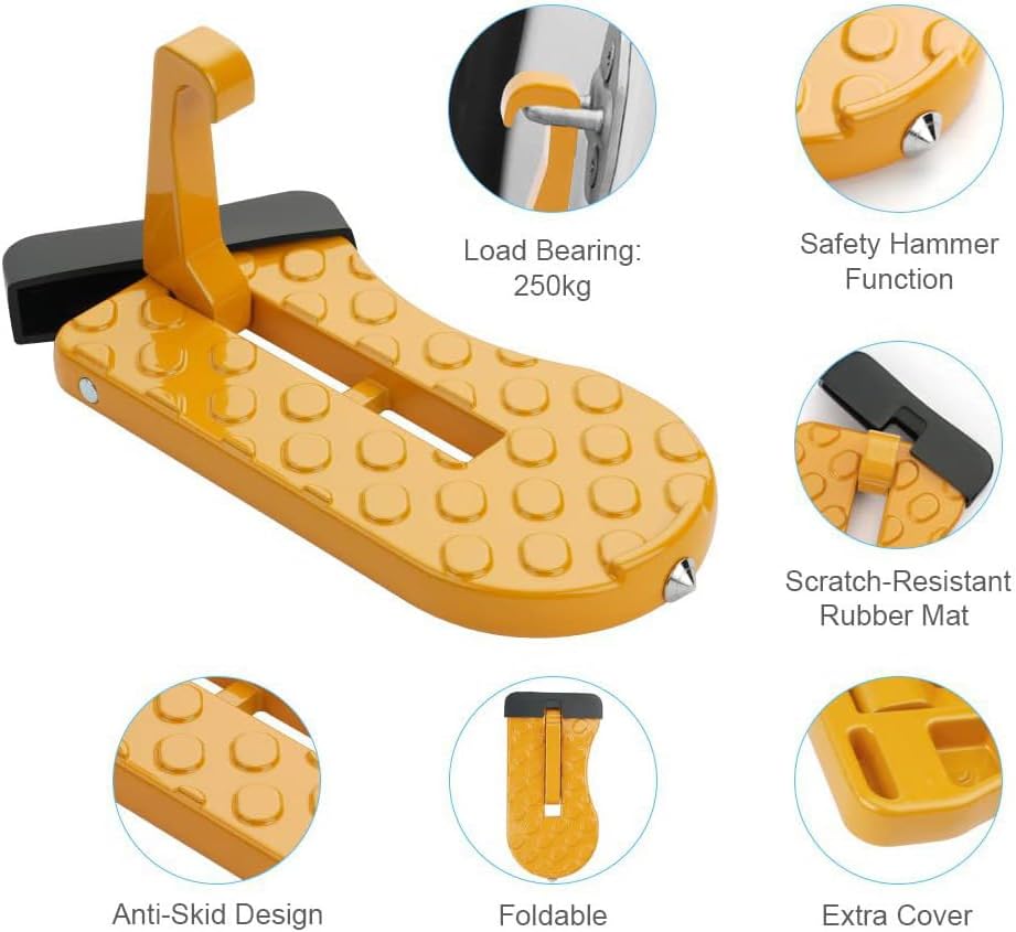 عتبة باب السيارة لسهولة الوصول إلى السقف - خطاف خطوة للسيارة مصنوع من سبائك الألومنيوم متعدد الطي لمعظم السيارات وسيارات الدفع الرباعي والشاحنات - مع كاسر زجاج - ملحقات رف السقف - أقصى حمولة 400 رطل (عبوة واحدة صفراء)