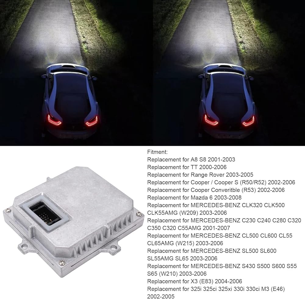 توافق شامل: تم تصميم موازن الإضاءة هذا ليناسب مجموعة واسعة من المركبات، بما في ذلك على سبيل المثال لا الحصر CLK320 CLK500 CLK55AMG (2003‑2006)، S430 S500 S600 S55 S65 (2003‑2006)، وكوبر المكشوفة (2002‑2006). بفضل تصميم دبوس الصابورة متعدد الاستخدامات، فهو متوافق مع كوابح البدء فائقة السرعة وأجهزة فك التشفير العاكس وأنواع المصابيح المختلفة مثل D1 وD2 وD3 وD4. وهذا يضمن إمكانية تثبيته بسلاسة في موديلات السيارات المختلفة.