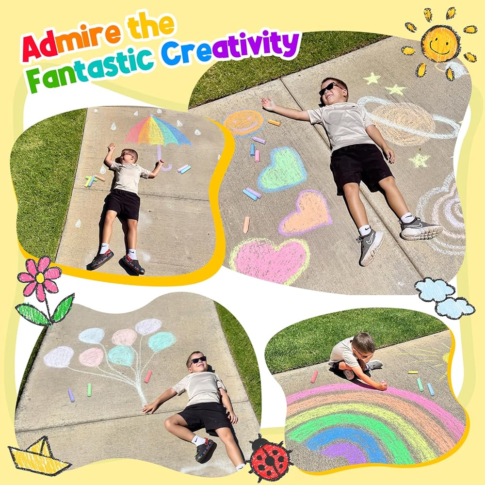 • هدية رائعة للرسم: سواء على الأرض أو السبورة أو الخشب أو البلاط أو الورق أو أي سطح آخر، يمكنك الرسم بثقة. مثالية للرسم على الأرصفة أو الشوارع أو الساحات أو الملاعب أو الممرات أو في الداخل، ويمكن استخدامها أيضًا لرسم شعارات لحفلات أعياد الميلاد أو أحداث العطلات أو العروض الترويجية، وما إلى ذلك. تقدم متعة وإبداعًا غير محدود للأطفال والمراهقين والبالغين، ويمكن للجميع المغادرة علامة فريدة من نوعها في العالم! هدية للأطفال الأولاد البنات.