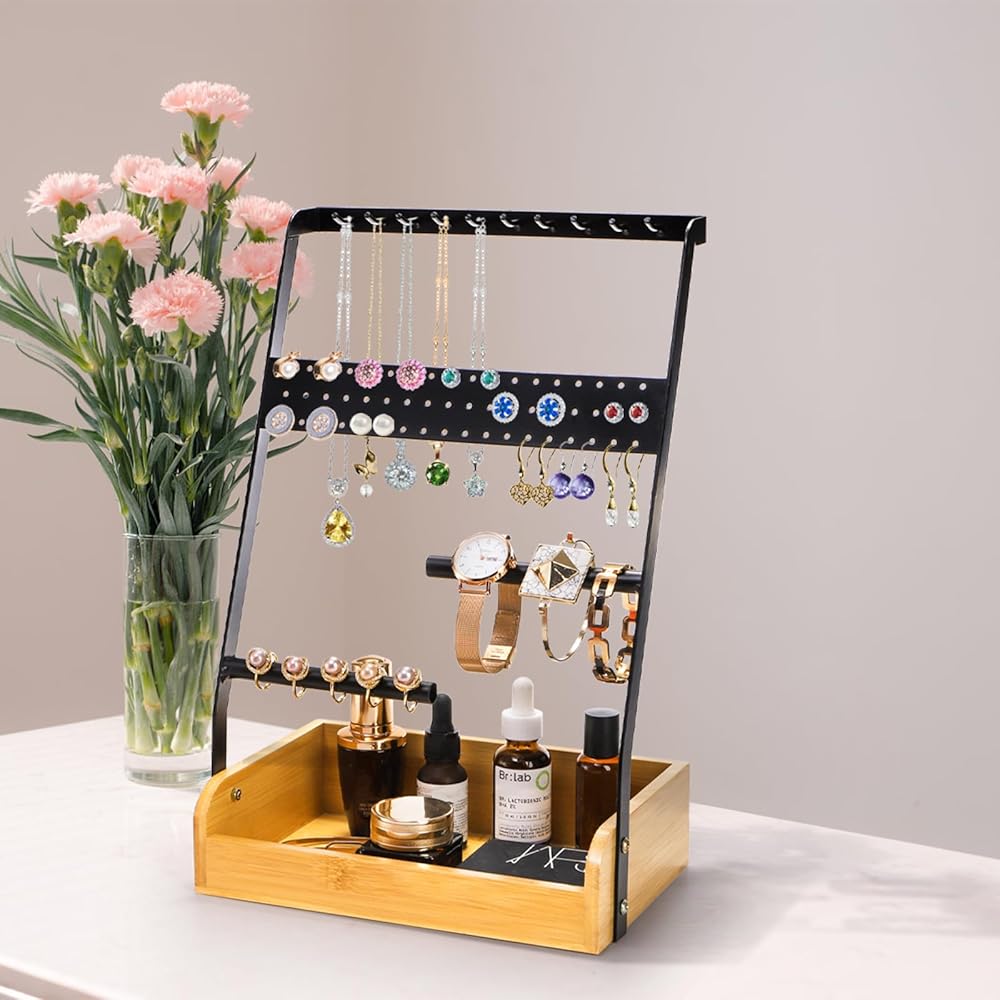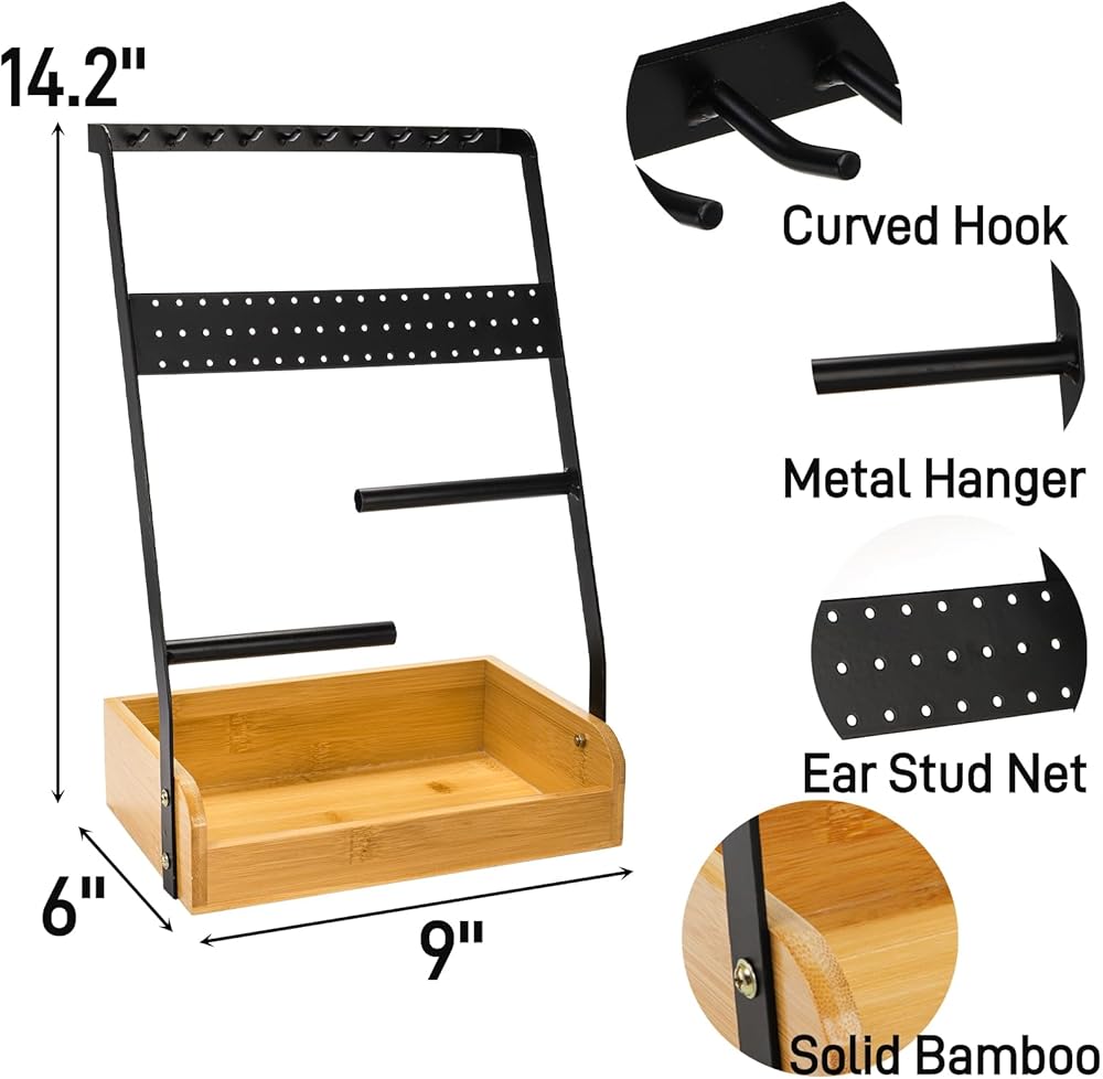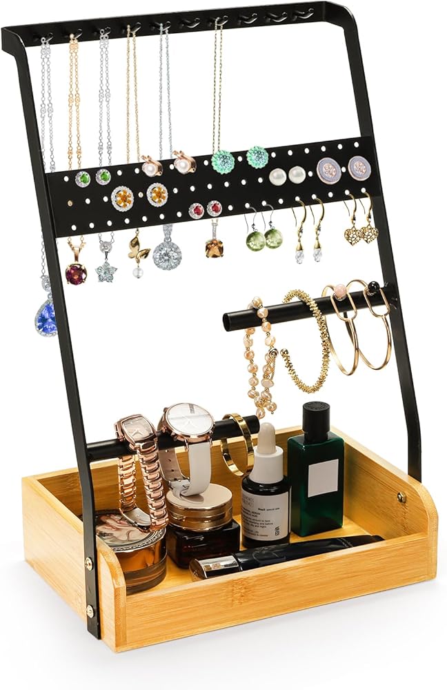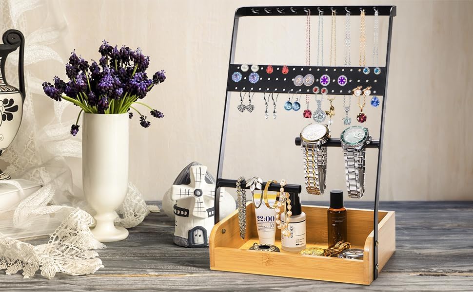 حامل منظم المجوهرات، حامل قلادة مكون من 10 خطافات مع صينية خشبية، رف عرض أقراط من 5 طبقات، شماعة سوار، قاعدة تخزين العطور، برج مجوهرات للأزرار والساعات والأساور والسلاسل
