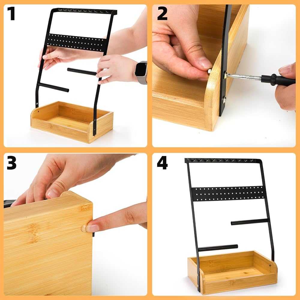 خامة فاخرة: منظم المجوهرات الخاص بنا مصنوع من الحديد عالي الجودة ومادة الخيزران الطبيعية، وهو متين وليس من السهل أن يصدأ. مع طلاء أسود على السطح المعدني، سيمنحك السطح الأملس والخالي من العيوب إحساسًا أفضل بالاستخدام.