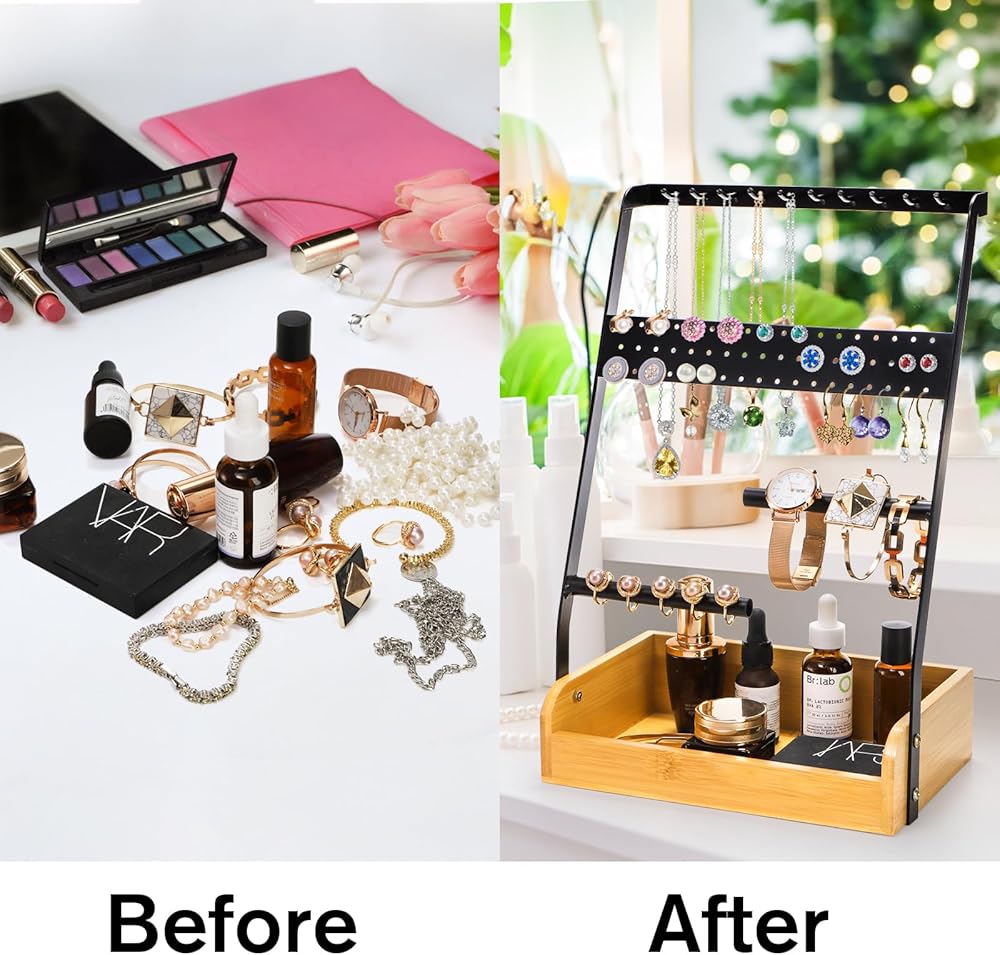 مناسب لحياتك: تم تصميم حامل منظم المجوهرات بومتوس مع شبكة تنظيم الأقراط وخطافات القلادة وشماعات الأساور وصينية خشبية. يمكنها حمل العديد من الأساور والخواتم والقلائد والساعات والعطور وما إلى ذلك. كل نوع من المجوهرات له منطقة تخزين خاصة به، منظمة جيدًا لتتمكن من الوصول إلى كل شيء دون أي متاعب.
