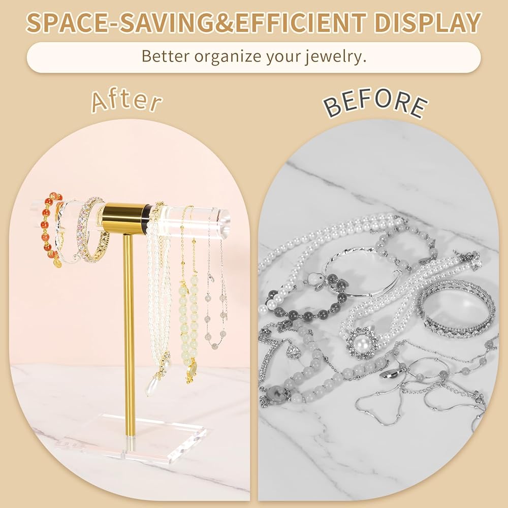 • صغير الحجم وعملي: حجم حامل السوار هو 4 بوصة عمق × 8.3 بوصة عرض × 10 بوصة ارتفاع، صغير الحجم وموفر للمساحة، مناسب لوضعه في خزانة غرفة النوم أو خزانة العرض. يعتمد حامل المجوهرات على طرازين من طبقتين، مع ارتفاع كافٍ للحفاظ على أغراضك قلادات طويلة من التشابك. يبلغ طول كل ذراع 20.32 سم ويمكن تعليق ما مجموعه 12-16 قطعة.
