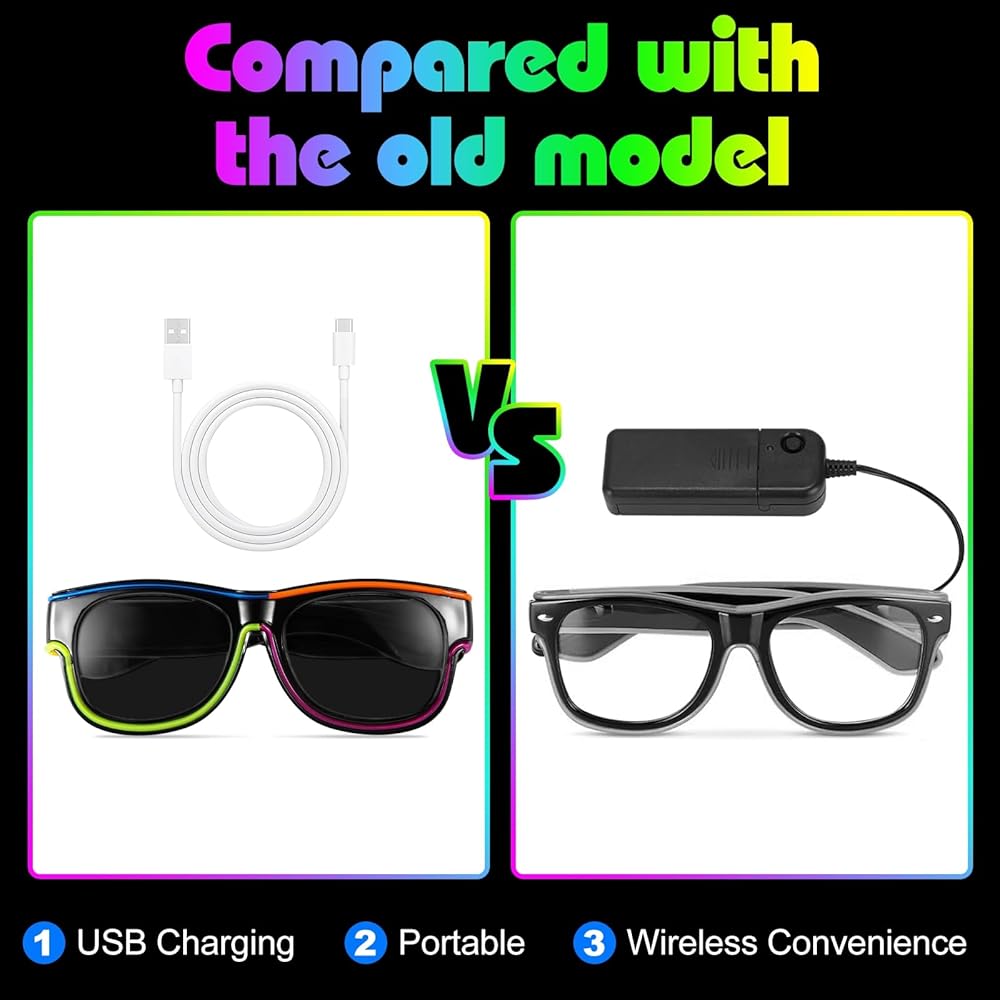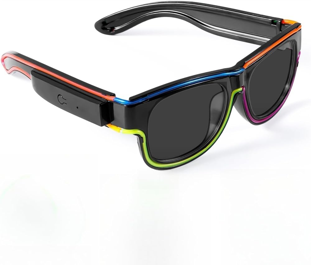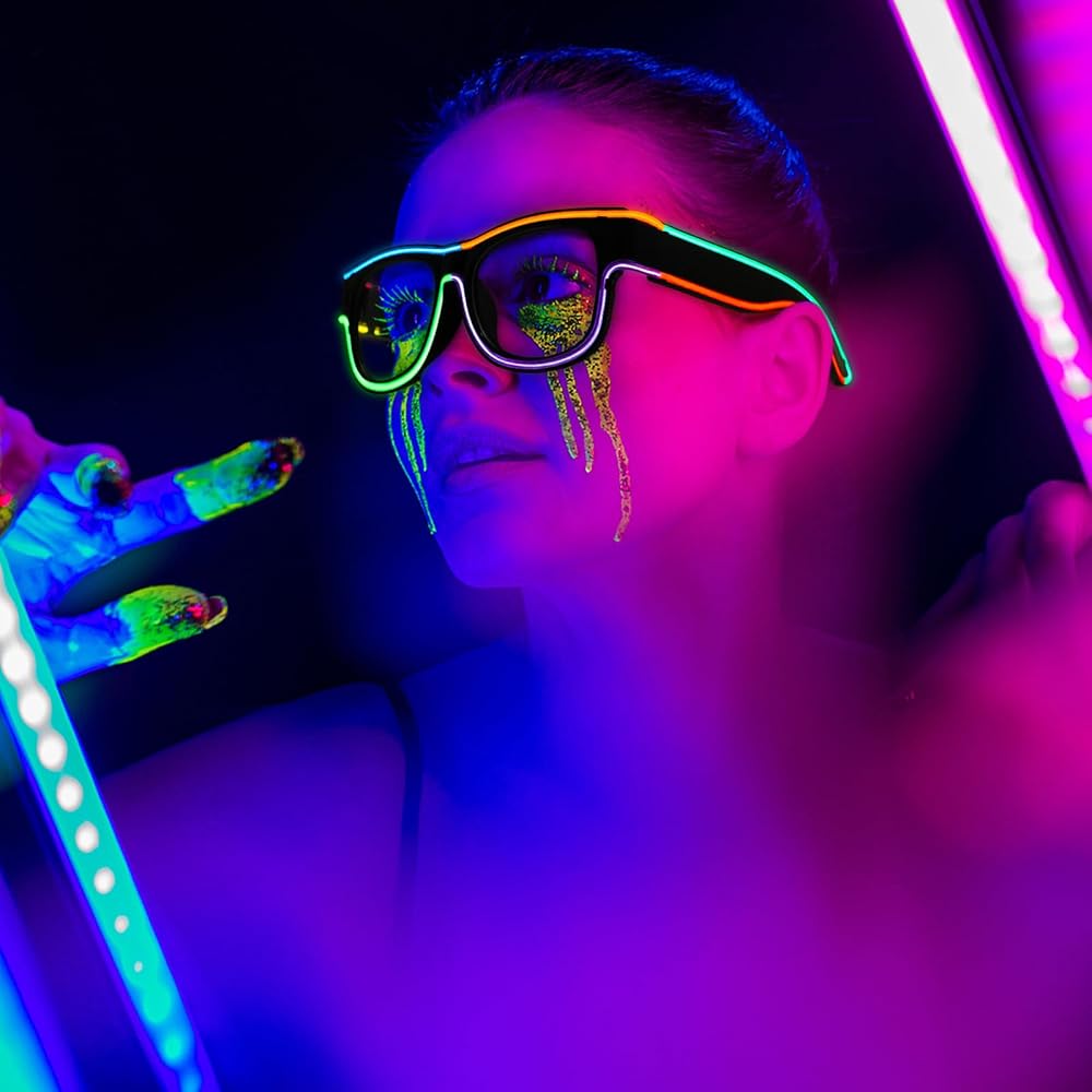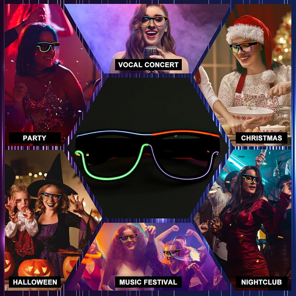 Stand-Out Style: Our LED glasses integrate 8 color light strips - pink, blue, orange, green, red, purple, fluorescent green, and yellow, which are very eye-catching.The sleek black frame ensures you look cool while standing out in the dark