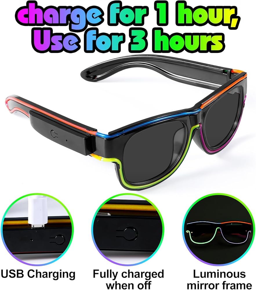 Wireless Convenience: Enjoy the freedom to move with no strings attached. Our Rechargeable led futuristic glasses free you from cumbersome wires, with a battery life that supports 3 hours of continuous fun on just a one-hour charge