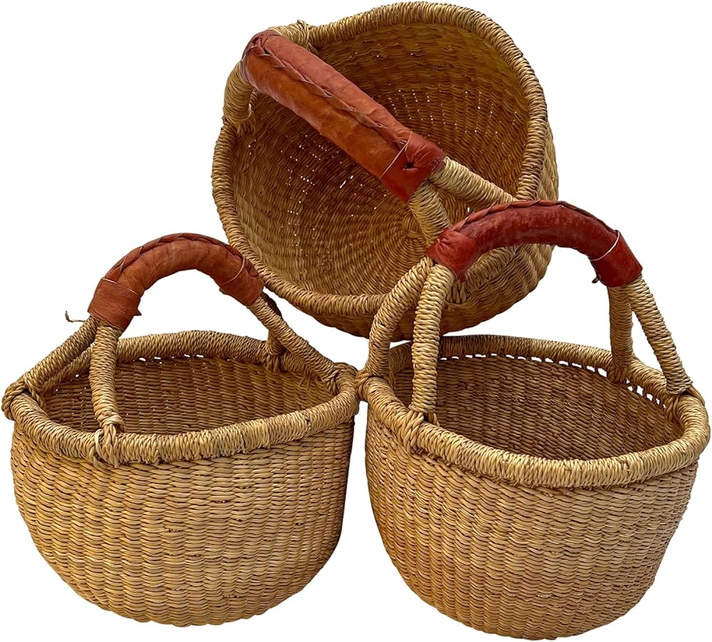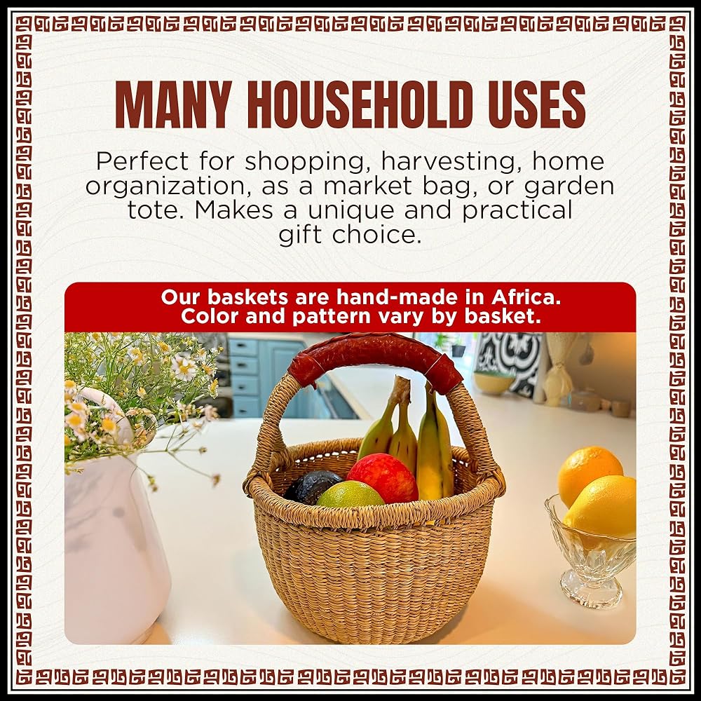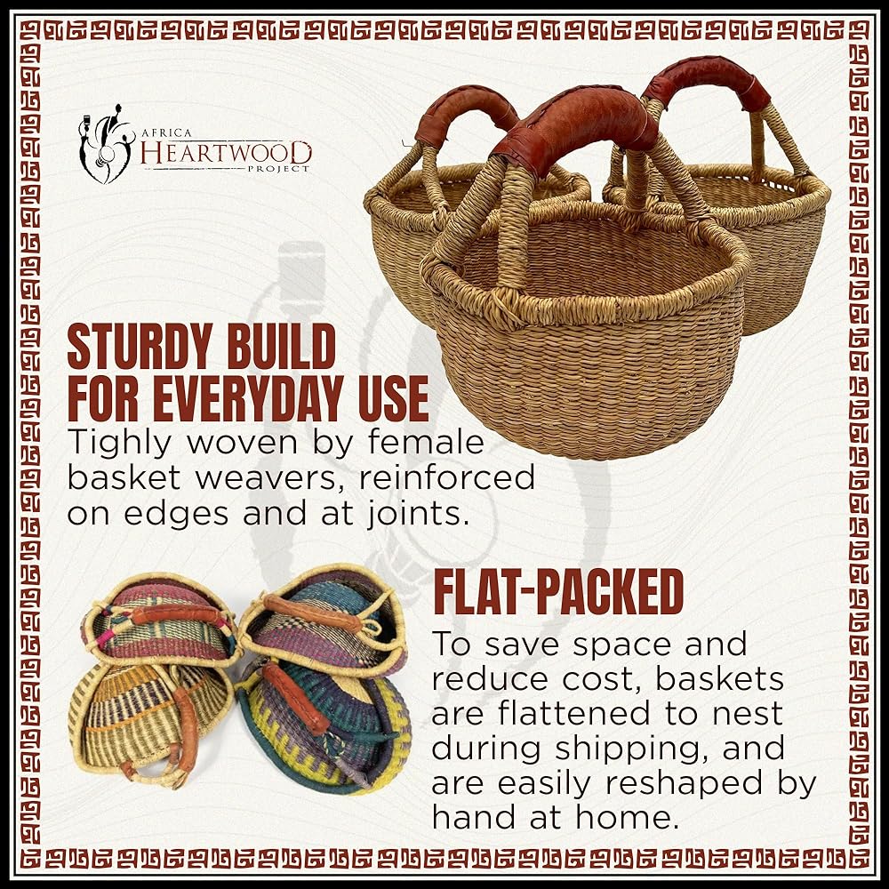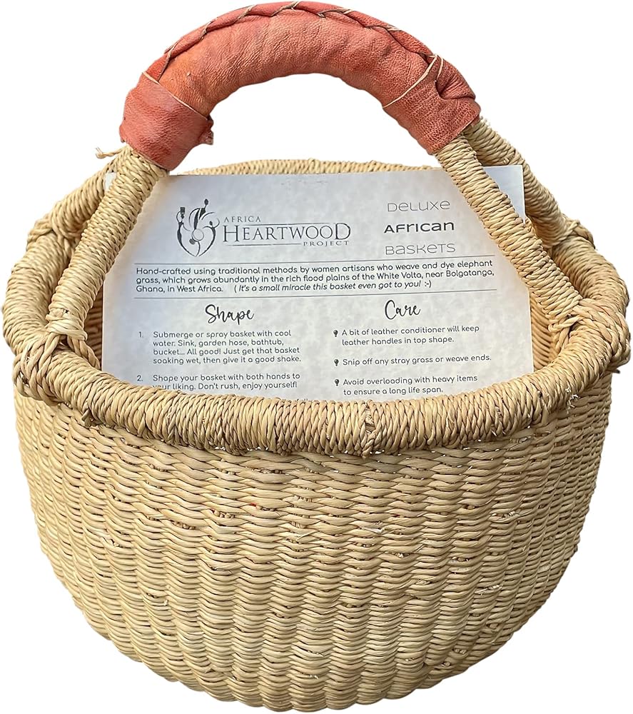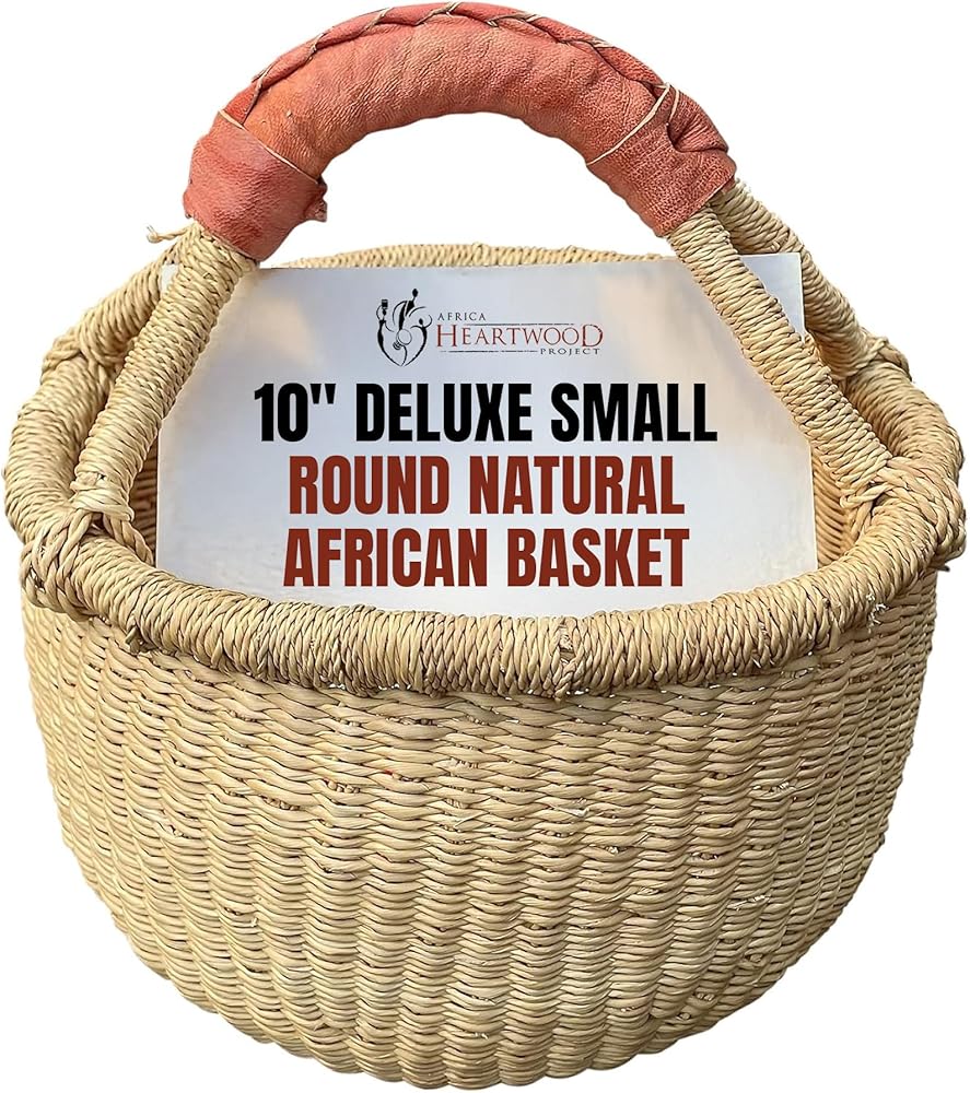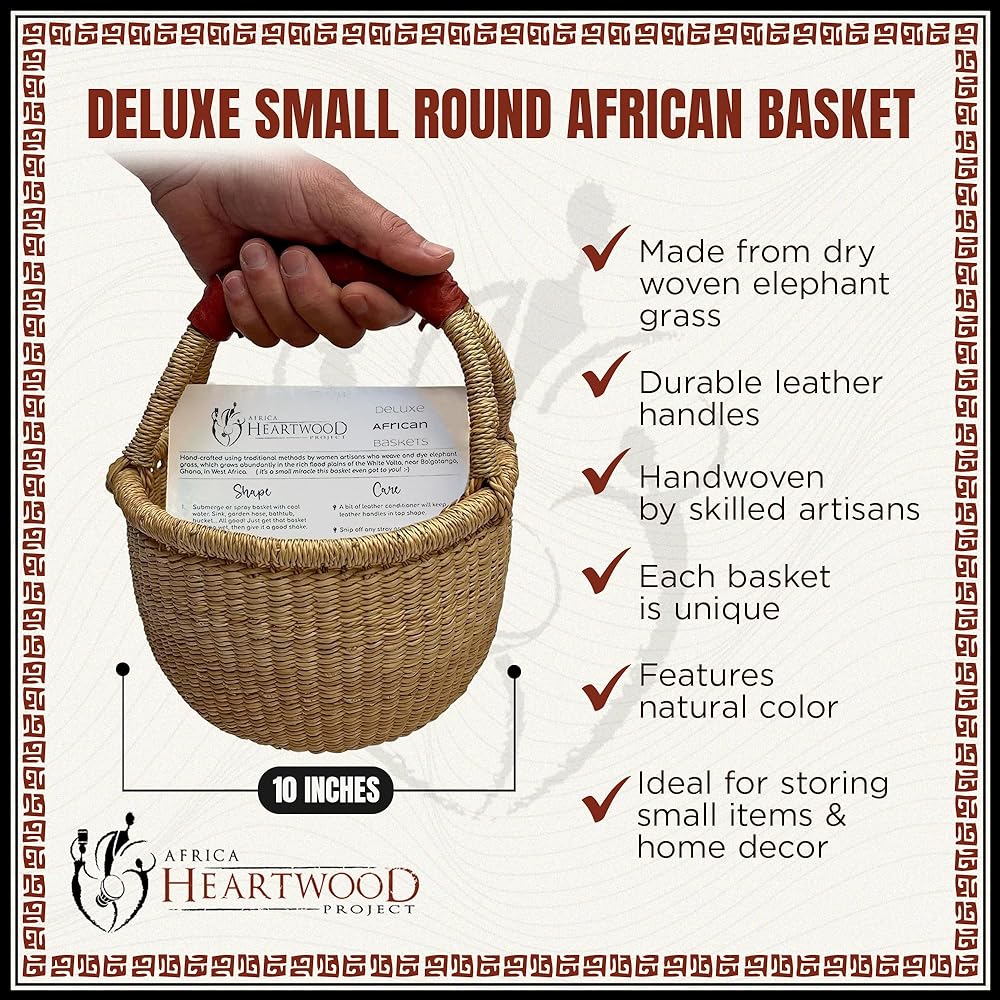 Our Deluxe Small Round Natural African Basket from Africa Heartwood Project is simple and elegant, showcasing the natural light brown color of dried elephant grass with no added dyes or patterns. Hand-woven by artisans in Bolgatanga, each woven basket is a masterpiece of design and durability, made from locally sourced elephant grass. Featuring robust leather handles and a compact build, these baskets are ideal for various applications, such as collecting eggs or herbs, displaying soaps or dishcloths, storing small crafts, or showcasing a small pot of flowers.
