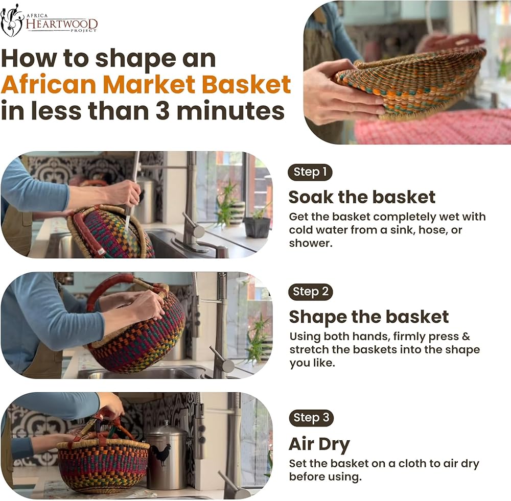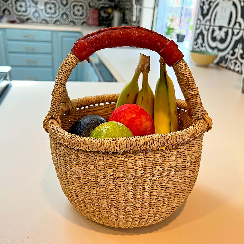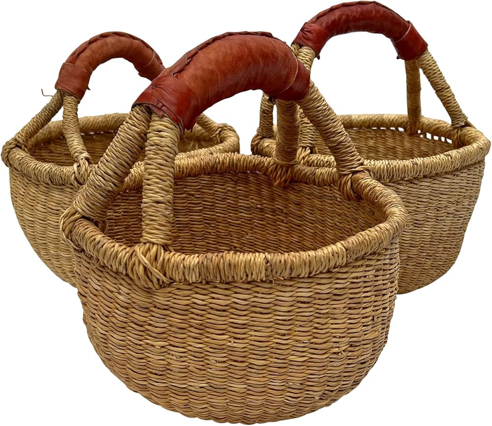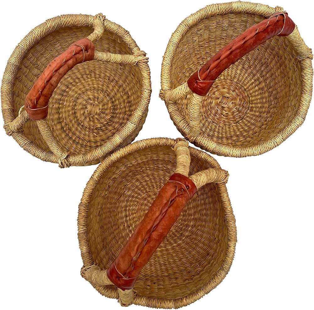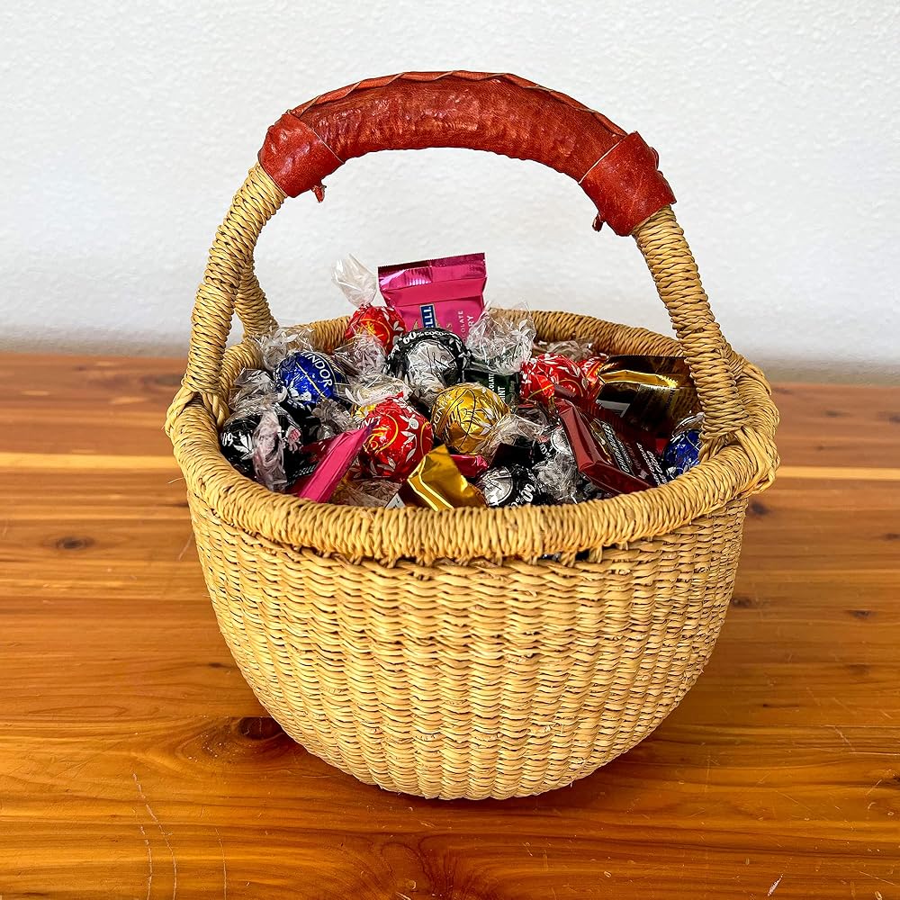 Our Deluxe Small Round Natural African Basket from Africa Heartwood Project is simple and elegant, showcasing the natural light brown color of dried elephant grass with no added dyes or patterns. Hand-woven by artisans in Bolgatanga, each woven basket is a masterpiece of design and durability, made from locally sourced elephant grass. Featuring robust leather handles and a compact build, these baskets are ideal for various applications, such as collecting eggs or herbs, displaying soaps or dishcloths, storing small crafts, or showcasing a small pot of flowers.