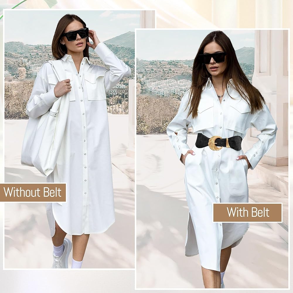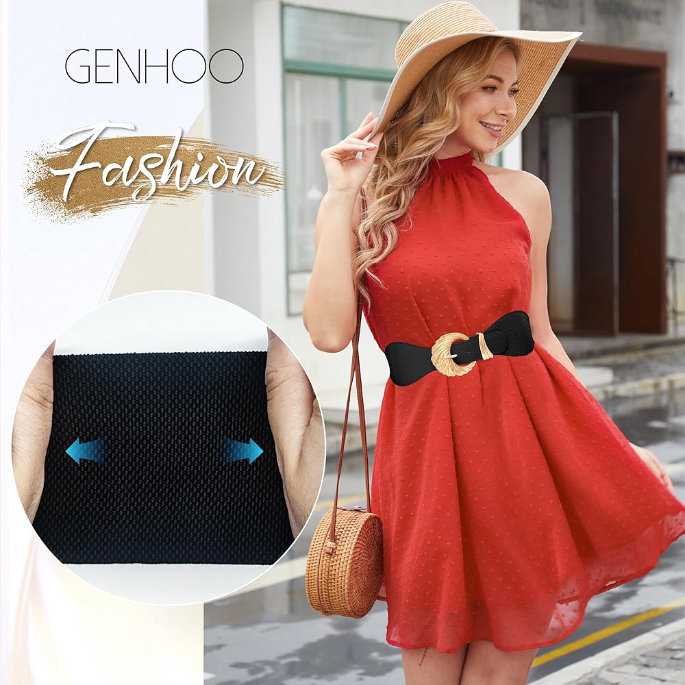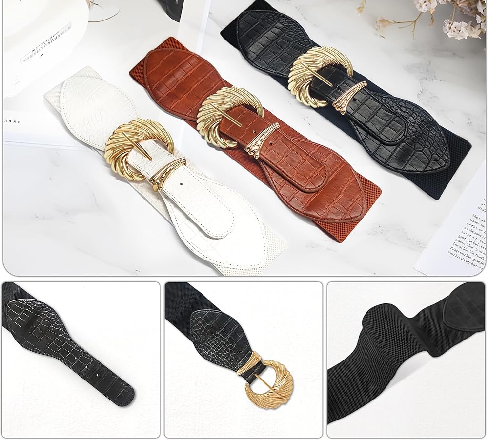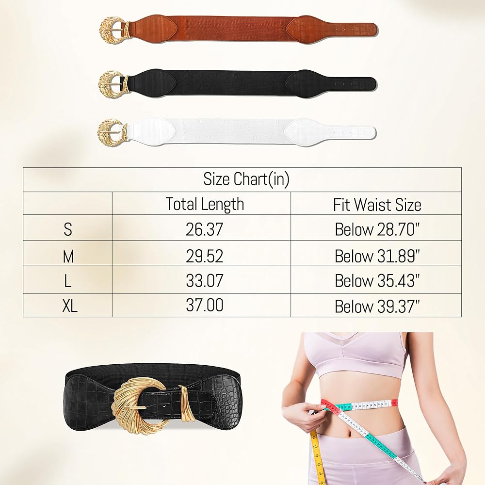 التصميم: أحزمة واسعة للسيدات تتميز بإبزيم معدني ذهبي وتصميم بثلاثة فتحات، سهلة الارتداء والخلع وضبط طول حزام الخصر، شريط مطاطي في الخصر الخلفي للحصول على ملاءمة مثالية، يبقيك مرتاحًا طوال اليوم