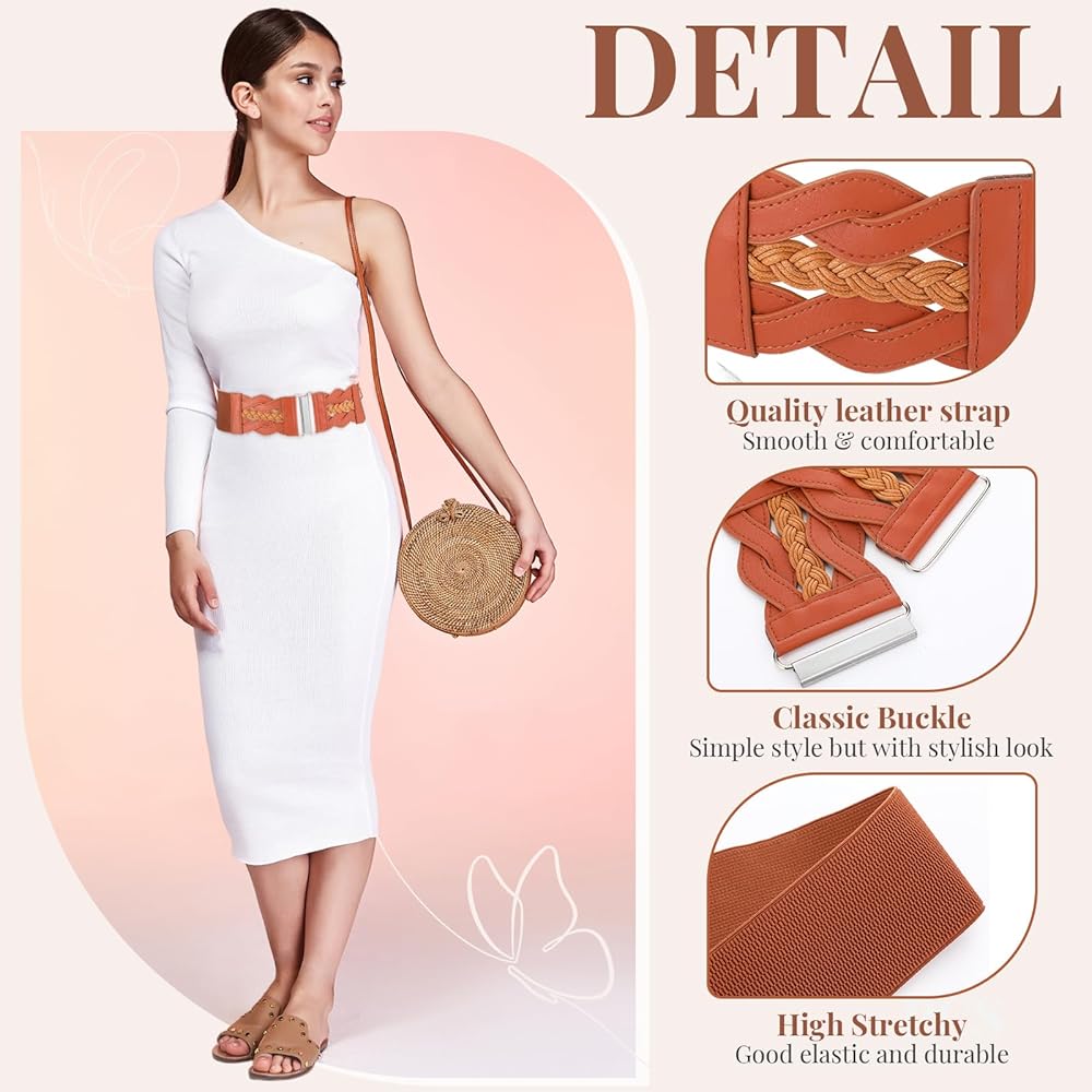 خامة مريحة وعالية الجودة: أحزمة الفساتين المرنة هذه للنساء مصنوعة من مزيج مريح من المواد، بما في ذلك إبزيم معدني، ونسيج عالي التمدد، والجلد الصناعي؛ توفر العناصر الناعمة والمرنة مرونة لطيفة تناسب جسمك بشكل مريح، مما يجعلها ممتعة للارتداء لفترات طويلة