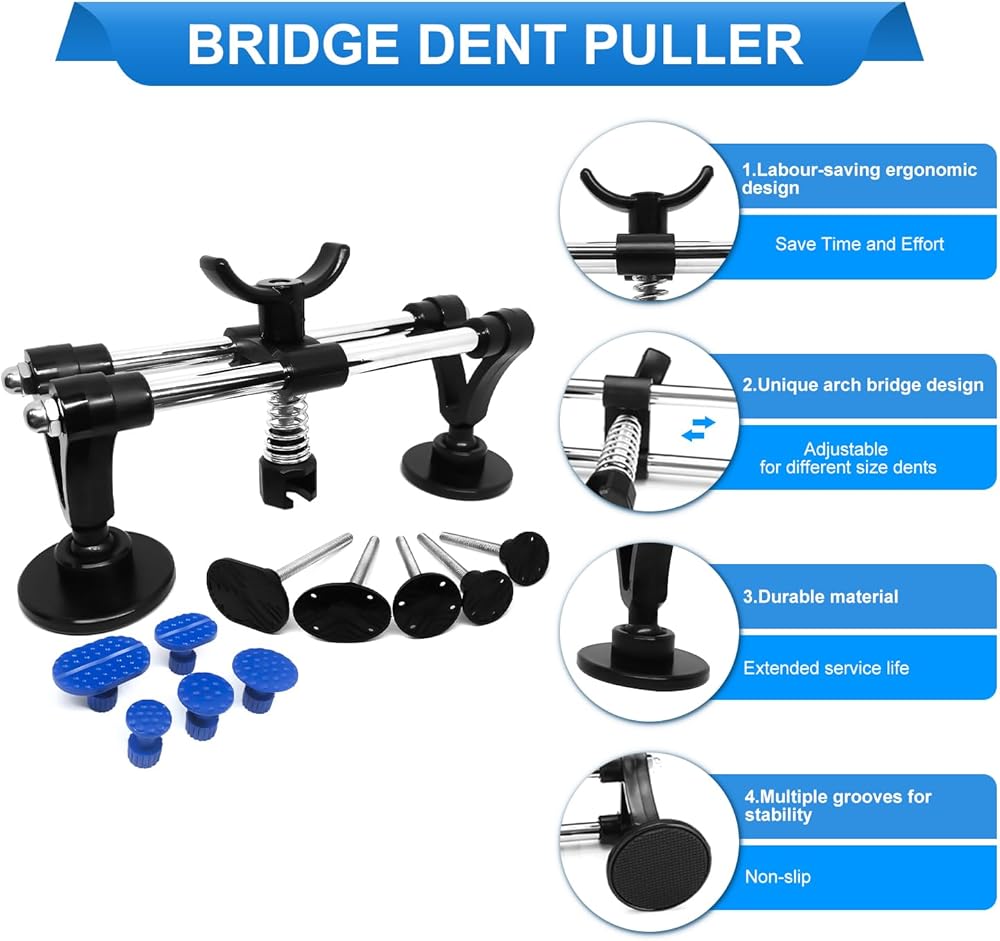 التصميم الفيزيائي - استخدام مبدأ الرافعة المالية لتصميم أداة سحب الانبعاج هو أمر مريح، حيث يمكن لساحب جسر الدنت مع جسر مقوس فريد ضبط المسافة وتدوير الزر ليناسب الانبعاجات بشكل أفضل، وأكثر كفاءة وعمل.