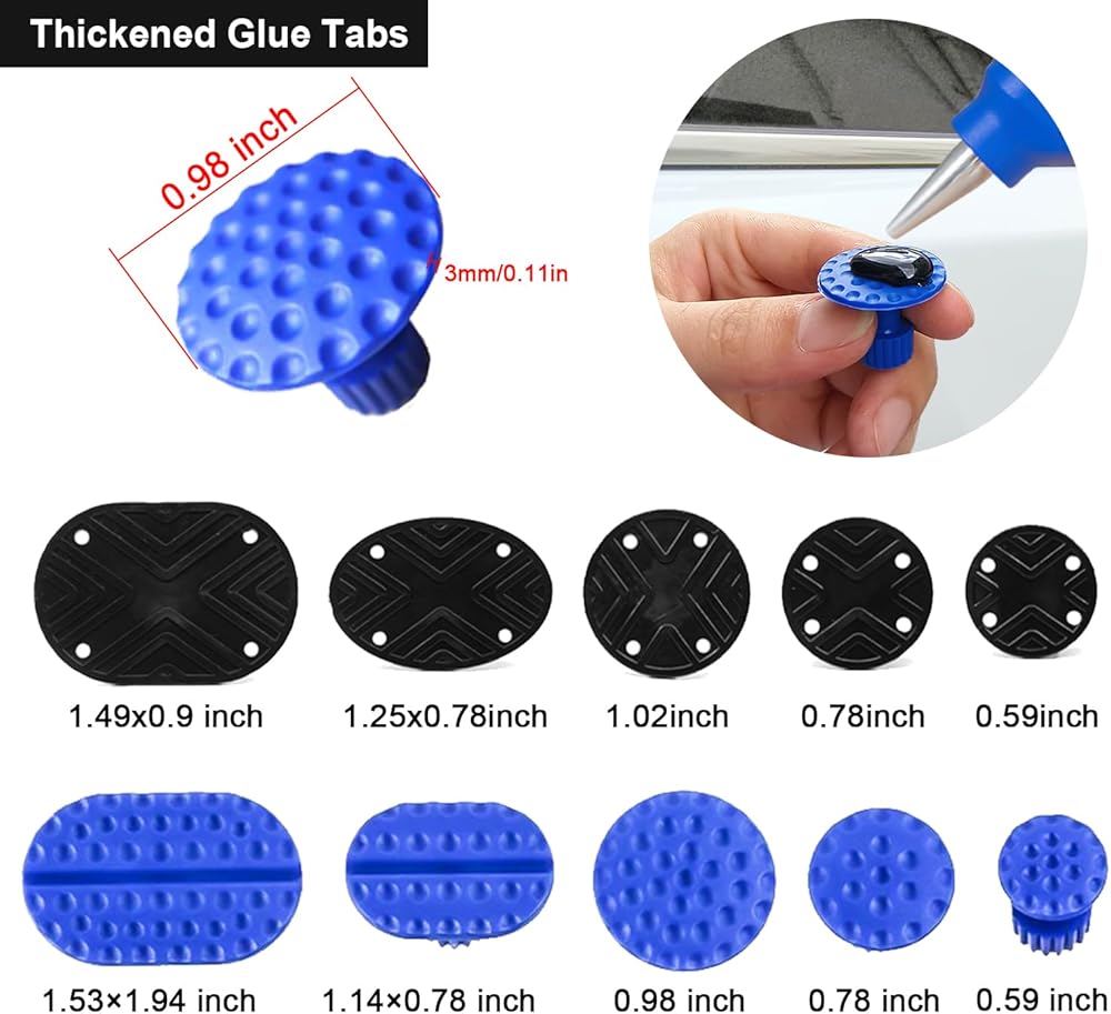معلومات العبوة: قطعة واحدة من أداة سحب الانبعاج ذات القطب المزدوج، 5 قطع من علامة سحب الانبعاج السوداء، 5 قطع من علامة سحب الانبعاج الزرقاء، قطعتان من مجارف الغراء، قطعة واحدة من الزجاجة الفارغة، قطعة واحدة من القماش الأسود النظيف (ملاحظة: لا يشمل مسدس الغراء والغراء)