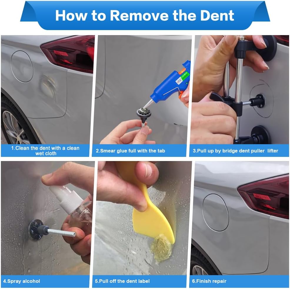 انتبه: لا يشتمل منتج Dent Puller هذا على مسدس الغراء وعصي الغراء، ونقترح على المستخدم شراء مسدس الغراء الذائب الساخن وعصي الغراء الذائب الساخن للعمل معه. كما أنه فعال على الأسطح المعدنية الرقيقة وغير مناسب للأسطح المعدنية التي يزيد سمكها عن 1 ملم.