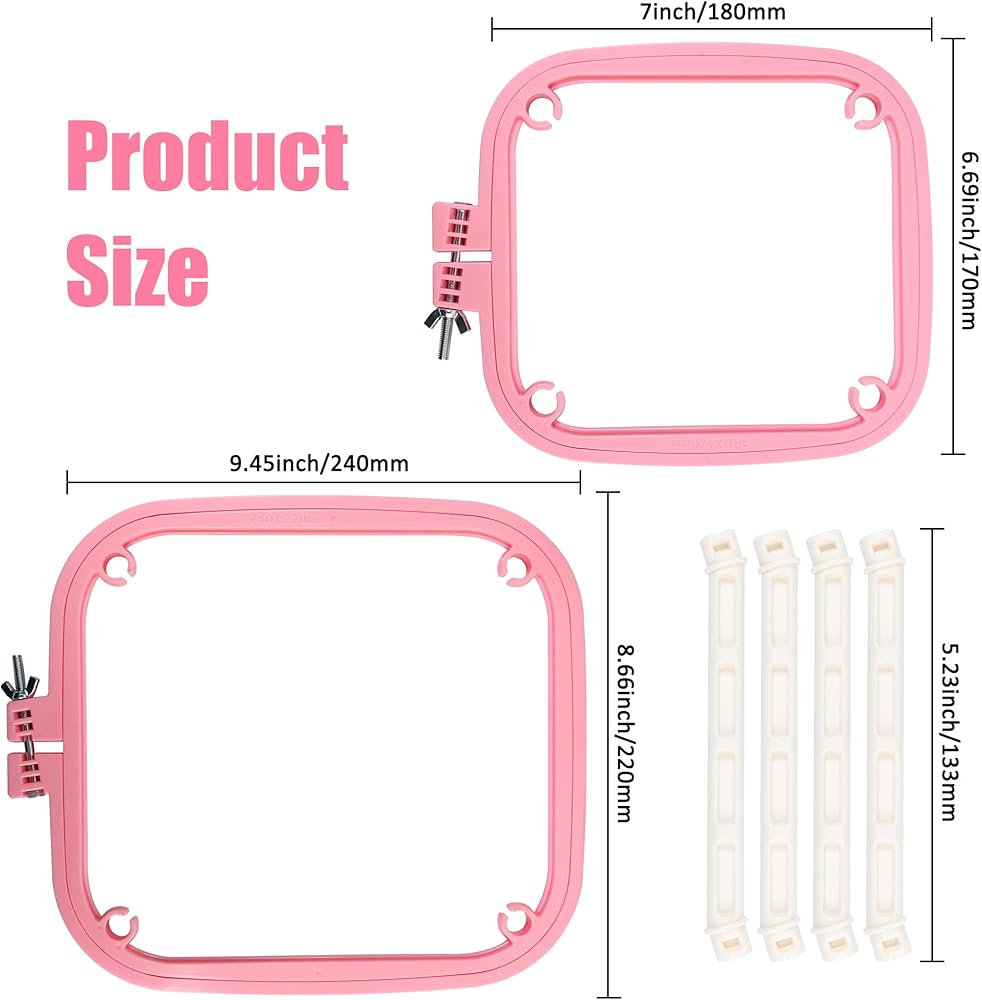 تشمل العبوة: يتكون حامل أطواق التطريز الخاص بنا من مقاسين مختلفين من إطارات التطريز البلاستيكية المربعة (7 × 6.69 بوصة، 9.44 × 8.66 بوصة) و4 قضبان دعم لتشكيل حامل تطريز على سطح الطاولة. يمكن أن تلبي احتياجاتك من التطريز بأحجام مختلفة في نفس الوقت.