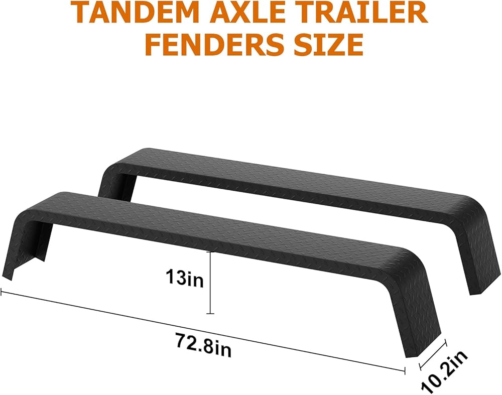• 【PERFECT COMPATIBLE with MOST 13"-15" TIRES】Our trailer fenders double axle size is 72-7/8"x10-1/4"x13", and it are expertly designed to compatible with tandem axle trailers with tire sizes ranging from 13",14”,15". Experience easy installation and a precise fit for your trailer.