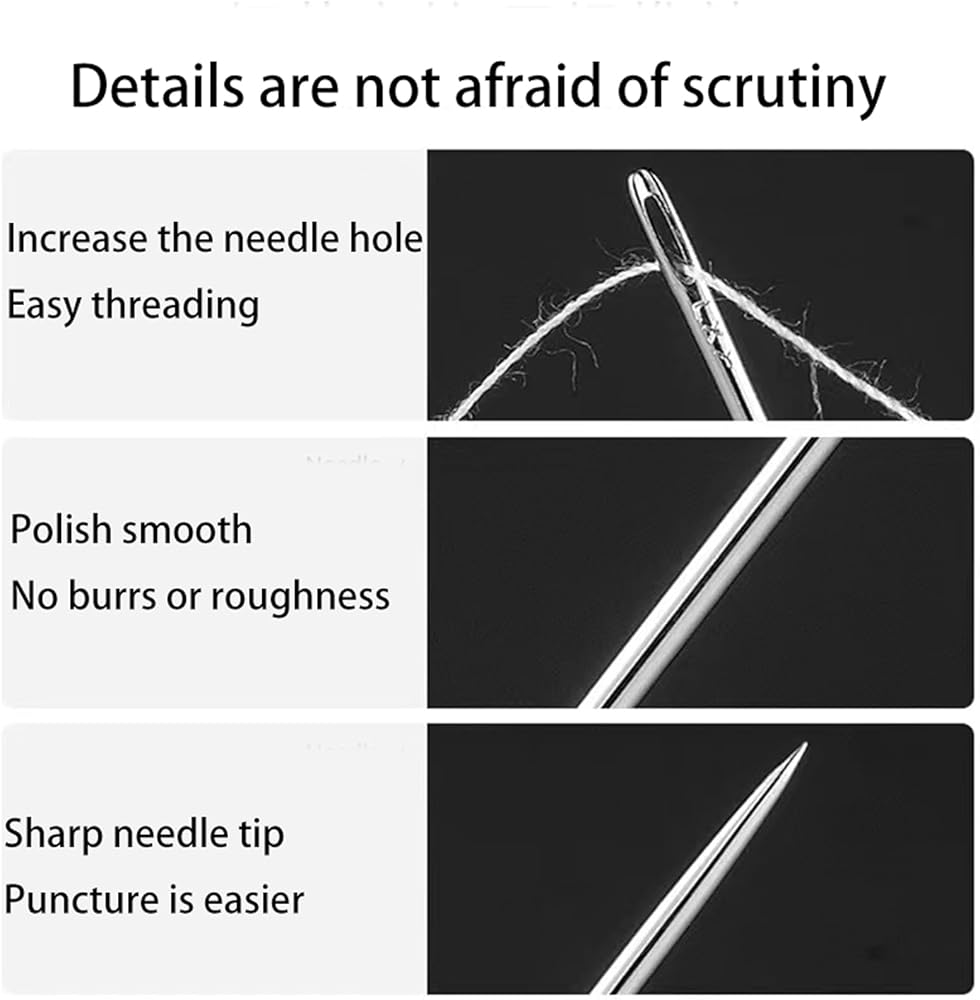 【Needle Material】:Our large eye pointed stitching needles are made of high quality stainless steel, with sharp needles, smooth surface, durable and not easy to bend, not easy to rust, corrosion resistant, the resistance through the cloth is small, it is easier to slip through,These large eye sewing needles come with a transparent needle bottle where you can easily carry and store them.