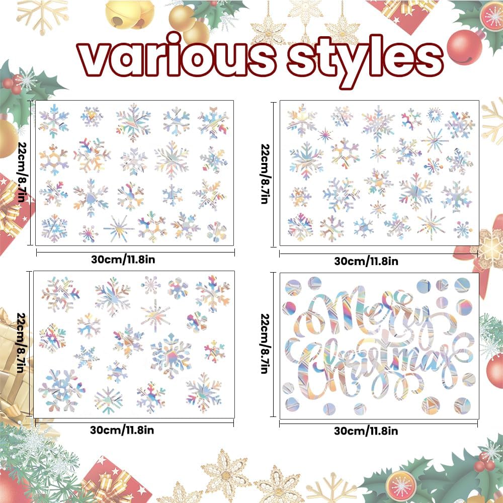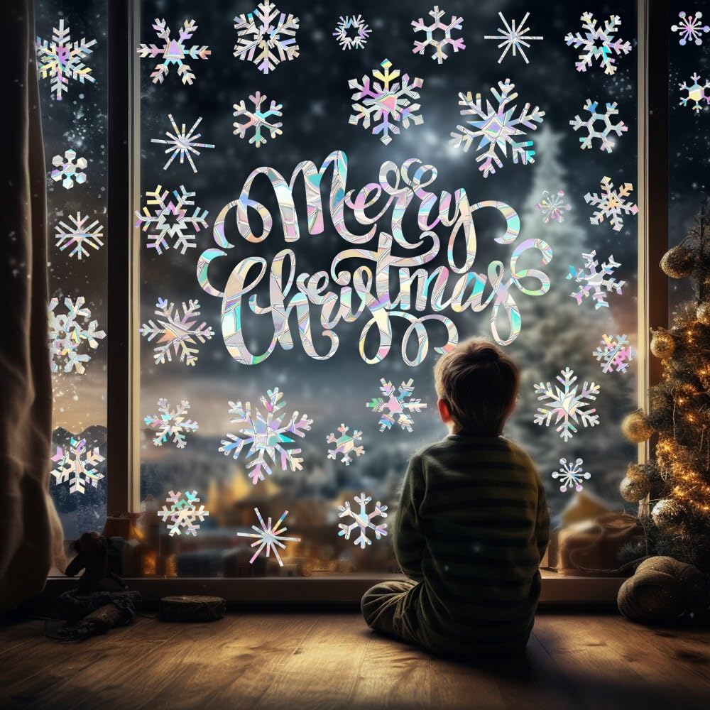 【HIGH QUALITY MATERIAL】 These prismatic Christmas clings are made of quality vinyl, strong and sturdy for you to use, easy to stick and remove, no glue, no residue, not damage of windows, and reusable, meeting your long time use needs. For the best use experience, please clean the surface of your item's and spray a little water before use.