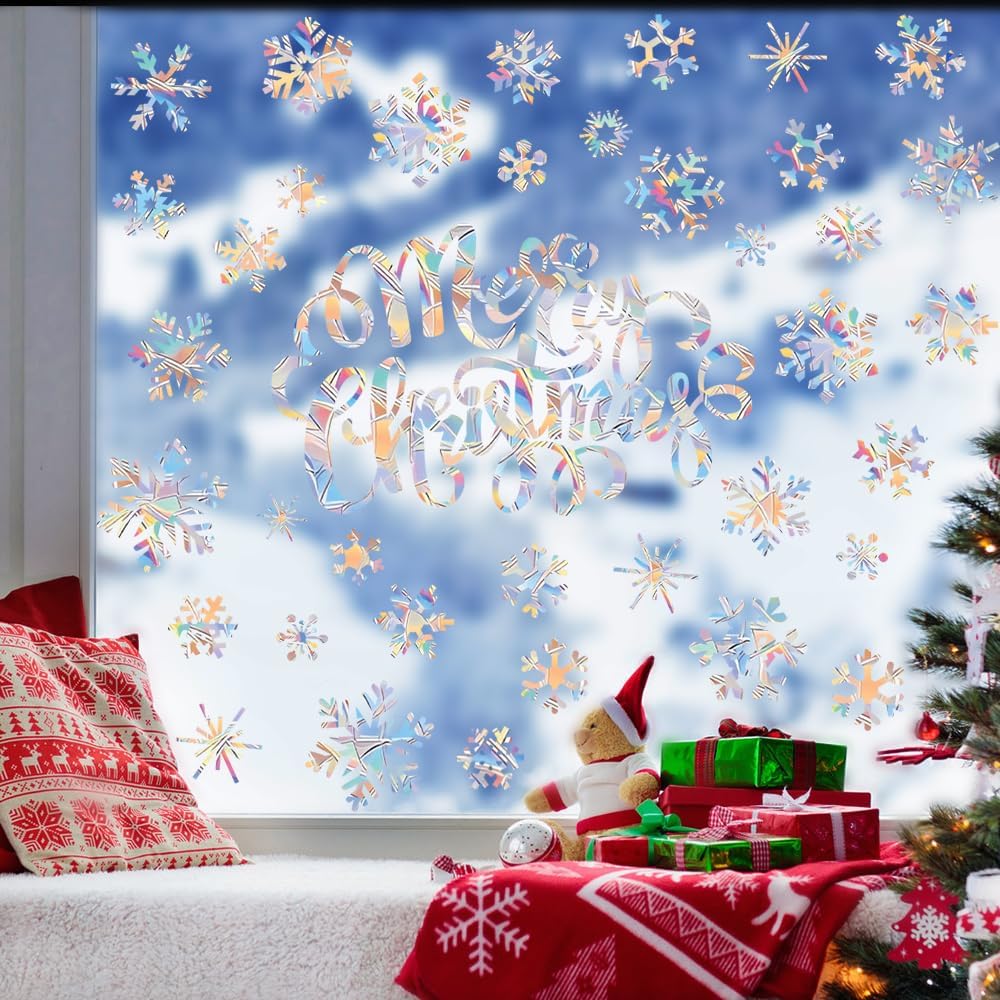 【RAINBOW PRISM DESIGN】 Christmas Anti-collision decals adopt different Christmas snowflakes and "Merry Christmas" patterns, charming and lovely,shinny and eye-catching. Decorate your windows or glass doors with these Christmas decorations that can capture the suns rays and turning into bright rainbows throughout the room.