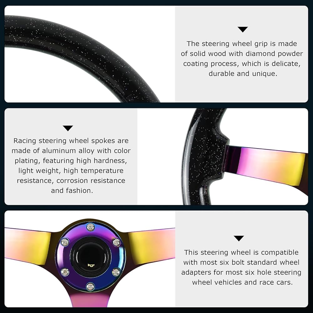 ملاحظة رئيسية: لا تشتمل عجلة القيادة هذه على محول محور. قبل الشراء، يرجى التأكد من أنه يمكنك العثور على محور 6 مسامير مناسب لسيارتك، وإلا فلن تتمكن من تثبيت عجلة القيادة هذه