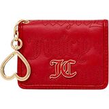 This small bifold card holder features faux leather construction, brand logo accents, heart-shaped easy-open key holder, chain link accents, gold tone hardware, driver's license or other identification card holder with transparent window on back exterior, snap fastening and 4 interior credit or debit card holder slip pockets.