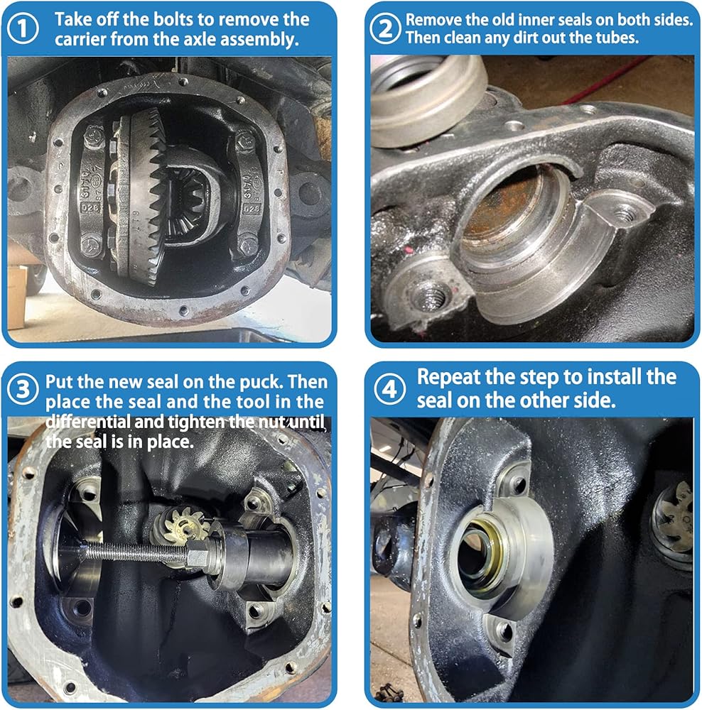 • EASY INSTALLATION:STEP 1:Take off the bolts to remove the carrier from the axle assembly. STEP 2:Remove the old inner seals on both sides. Then clean any dirt out the tubes.STEP 3:Put the new seal on the puck. Then place the seal and the tool in the differential and tighten the nut until the seal is in place.STEP 4:Repeat the step to install the seal on the other side.