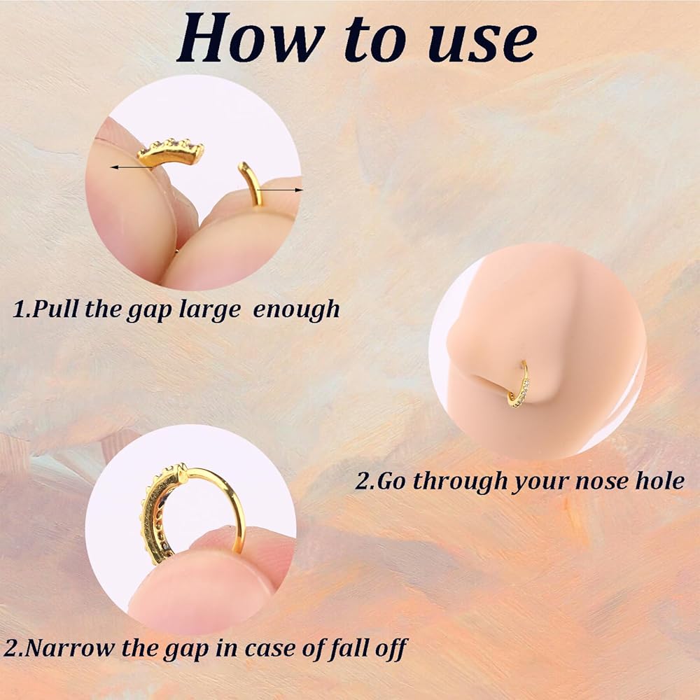 حلقات أنف فولاذية جراحية: حلقات الأنف الأنيقة هذه مصنوعة من الفولاذ المقاوم للصدأ 316L ذهبي اللون عيار 14 قيراط مع زركونيا مكعب AAAAA+، مما يضمن المتانة والراحة التي لا تسبب الحساسية ولمسة نهائية ناعمة تدوم طويلاً.