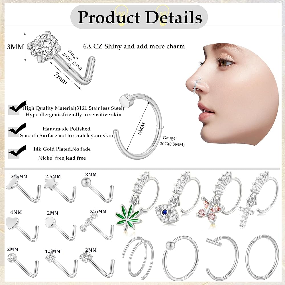 مجموعة حلقات الأنف الفاخرة من الذهب عيار 14 قيراط: تتضمن 22 قطعة من مجوهرات ثقب الأنف - 10 قطع من مسامير الأنف على شكل حرف L، و8 قطع من حلقات الأنف، و4 قطع من حلقات الأنف المتدلية. يمكن أن تمنحك مجموعة متنوعة من أنماط مجوهرات ثقب الأنف خيارات متعددة للارتداء حسب رغبتك يحب
