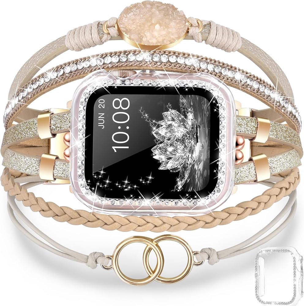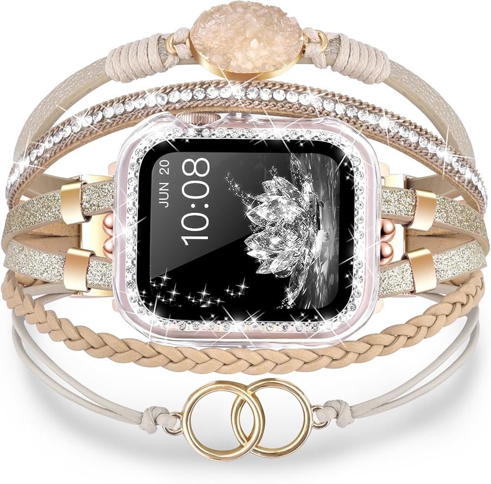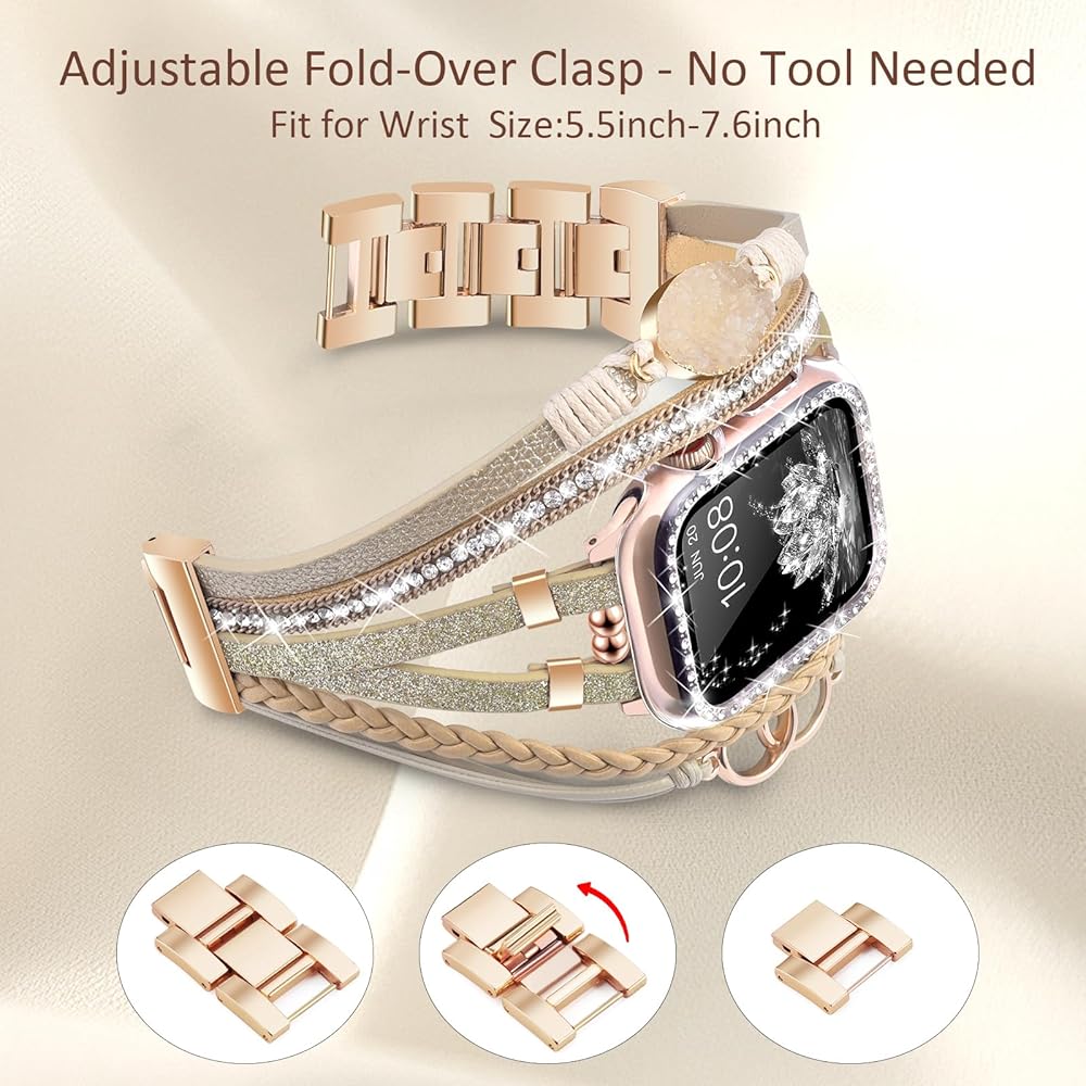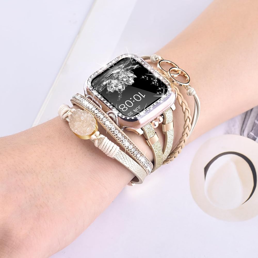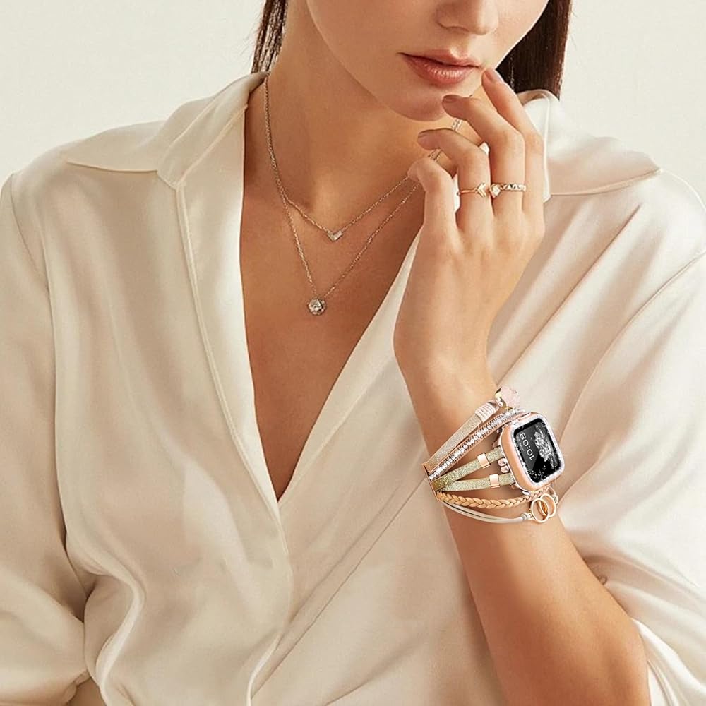 ⌚【نموذج متوافق 】سوار ساعة التفاح الجلدي بوهو للنساء متوافق مع جميع موديلات ساعات Apple 41 مم/40 مم/38 مم بما في ذلك سلسلة ساعات Apple 10(2024)، iWatch Series 9(2023)، السلسلة 8(2022)، السلسلة 7( 2021)، السلسلة 6 (2020)، السلسلة 5 (2019)، السلسلة 4 (2018)، السلسلة 3 (2017)، السلسلة 2 (2016)، السلسلة 1 (2015)، وiWatch SE. يحتوي السوار اللامع على 3 أحزمة إضافية قابلة للتعديل وصلات إبزيم لمعصم مقاس 5.7 بوصة - 8.2 بوصة. (يُرجى معرفة حجم معصمك وطراز الساعة قبل الشراء)