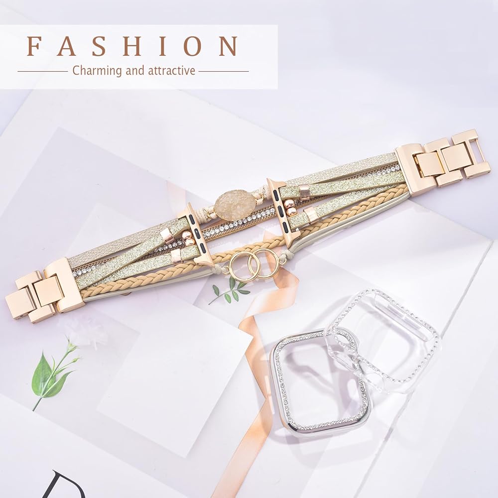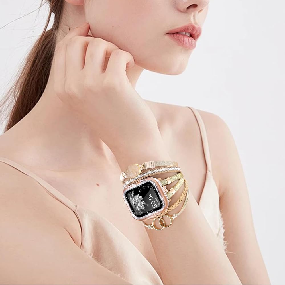 ⌚【سوار ساعة أبل من الجلد الأنيق】سوار ساعة أبل متعدد الطبقات مصنوع من خيوط متعددة من الحبال الجلدية بملمس مختلف ومزخرف بعناصر مختلفة، حجر طبيعي، كريستال طبيعي. يعتبر سوار iWatch النسائي مثاليًا للتوافق مع المجوهرات أو الملابس مما يجعل iWatch الخاص بك أكثر حساسية، مما يجعل ملابسك اليومية أكثر ذوقًا.