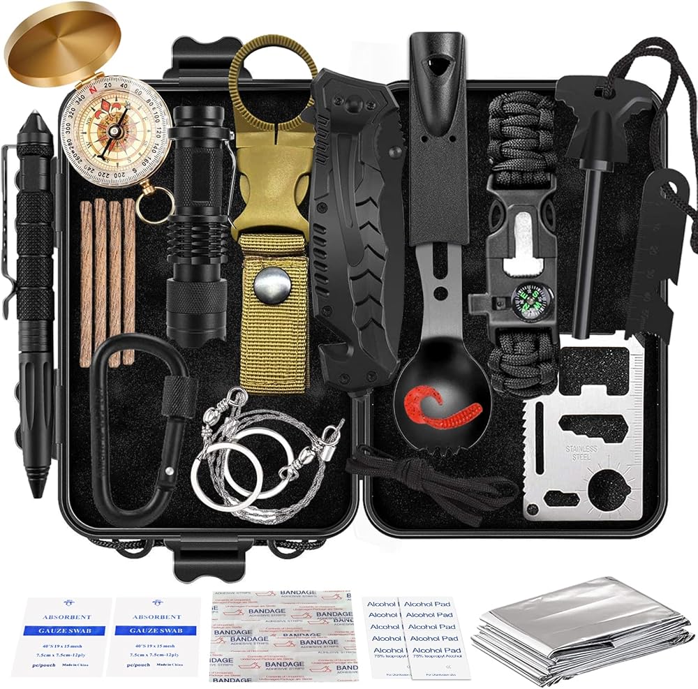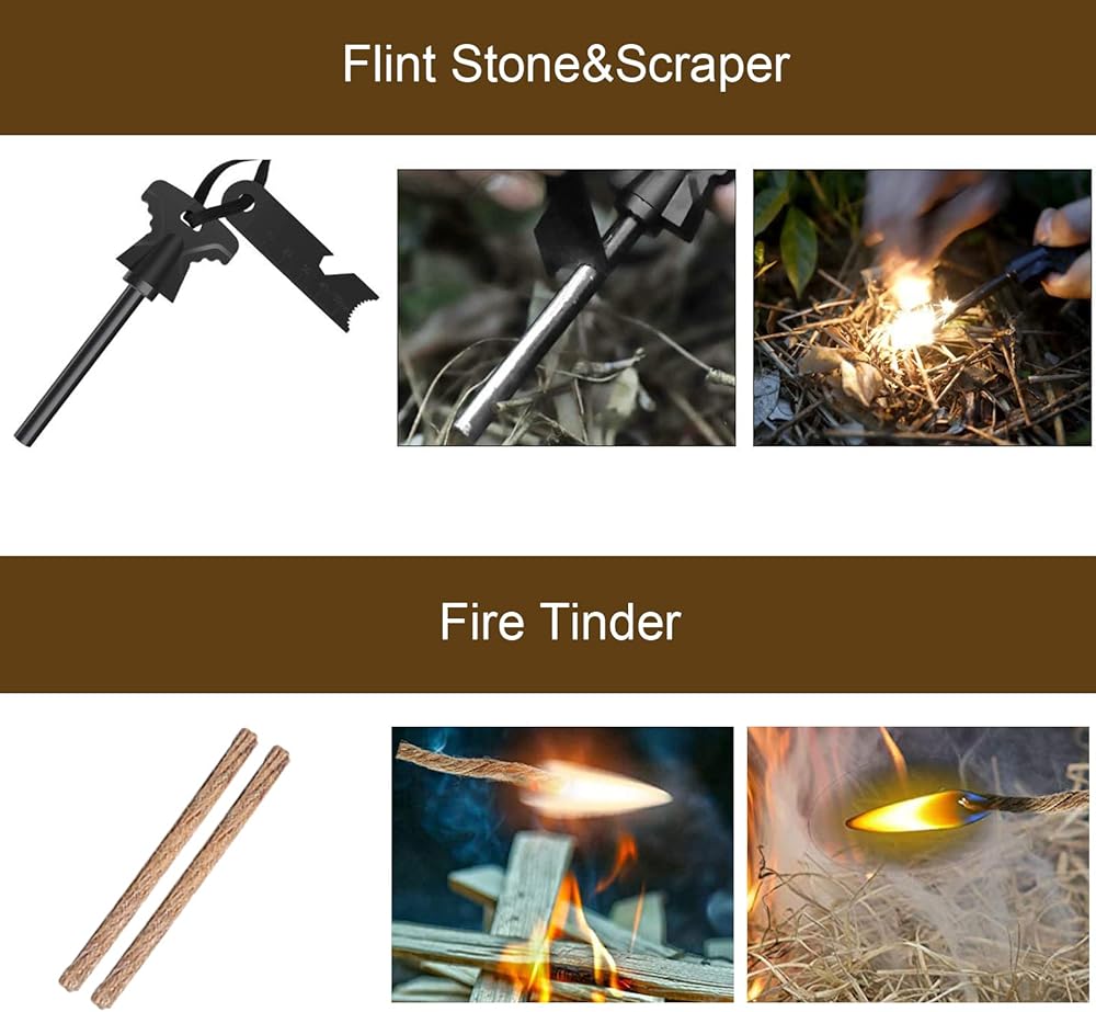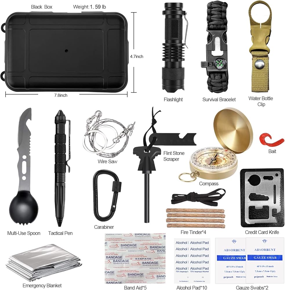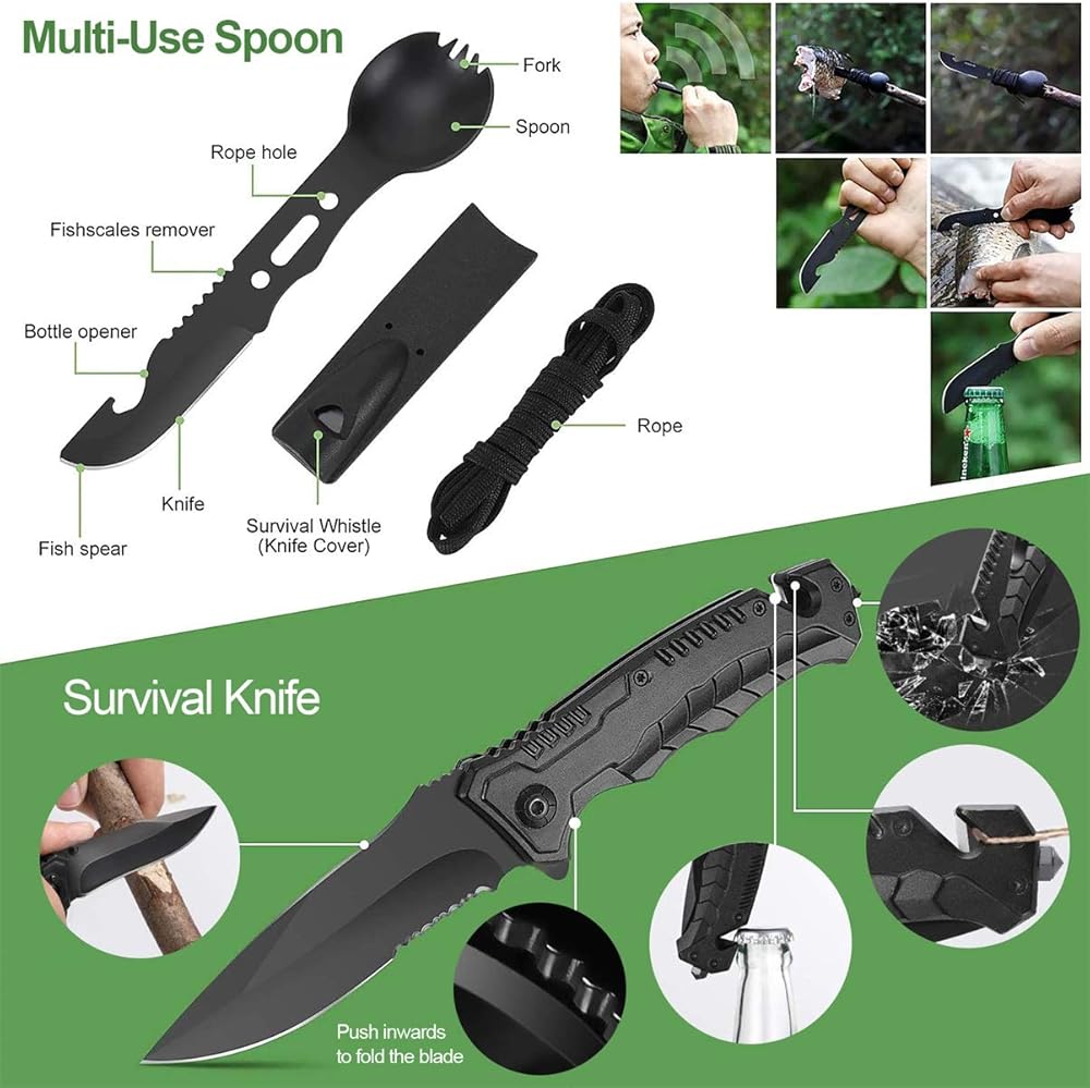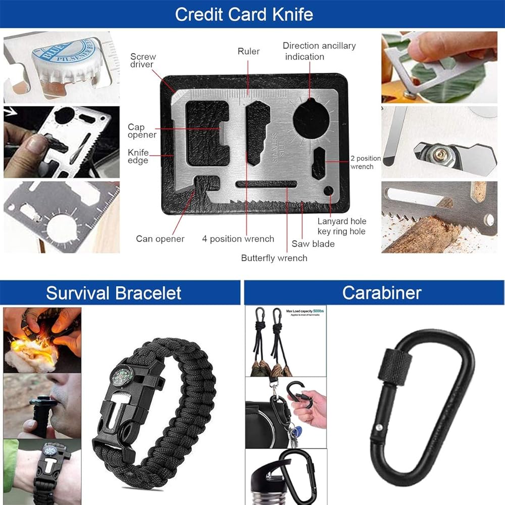 • 【مجموعة النجاة 36 في 1】- مجموعات النجاة الاحترافية في حالات الطوارئ مجهزة بـ 17 أداة عملية متعددة الوظائف، تحتوي على: سكين النجاة، بوصلة، منشار سلكي، مشبك زجاجة مياه، بطانية طوارئ، حجر الصوان، كاشطة، مصباح يدوي، قلم تكتيكي، البقاء على قيد الحياة سوار، ملعقة متعددة الاستخدامات، حلقة تسلق، سكين بطاقة الائتمان، صندوق أسود، طُعم، شعلة نار، ضمادة، ضمادة كحول، مسحات شاش.