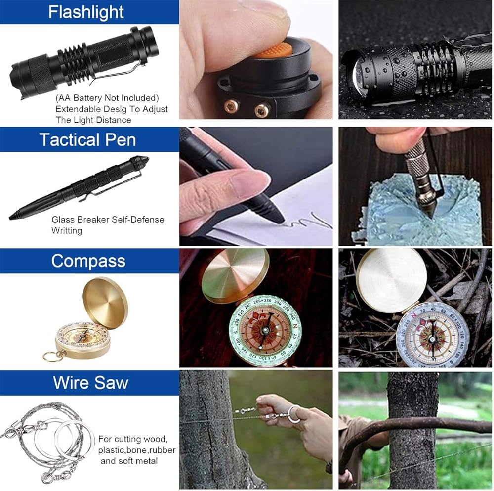 • 【ملاحظة: يأتي المصباح اليدوي بدون بطارية AA، أنت بحاجة إلى الشراء بمفرده. مجموعات النجاة هذه مناسبة لهدايا عيد الميلاد أو هدايا عيد الميلاد للآباء أو الأصدقاء أو الأطفال. إذا كان لديك أي أسئلة، فسنجيب عليها لك.