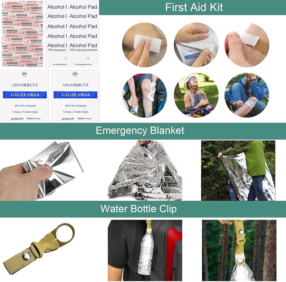 • 【مثالية لمختلف حالات الطوارئ】- تحتوي مجموعة النجاة على الأساسيات التي يمكن أن تساعدك على الحفاظ على سلامتك وراحة البال أثناء التنزه سيرًا على الأقدام أو التخييم أو الصيد أو صيد الأسماك أو السفر أو المغامرات. كما أنها مناسبة للبقاء على قيد الحياة في حالات الطوارئ في ظل الكوارث الطبيعية المختلفة. تحتوي مجموعة أدوات النجاة هذه على كل ما تحتاجه عندما يحدث ما هو غير متوقع.