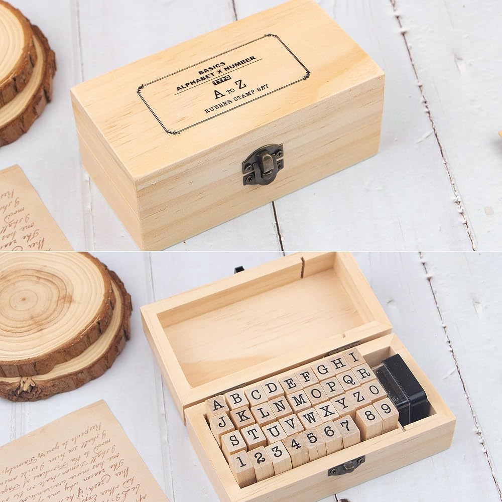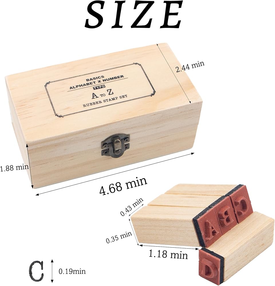 Include: 26 pcs A-Z alphabet stamps, and 10 pcs 0-9 number stamps, total 36 pcs little wooden stamps. Size:The wood box size is 4.68*2.44*1.88 inch, every stamp size is approx 0.35 x 0.43 x 1.18 inch, printing clay size is 1.18*1.18*0.7inch.