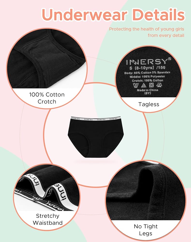 أساسيات الدورة الشهرية للفتيات: الملابس الداخلية للفترة من INNSERY مثالية للفتيات المراهقات بمقاسات 8-10، و10-12، و12-14، و14-16. تخلق هذه الملابس الداخلية القابلة للتنفس بيئة خالية من القلق لنمو الفتيات وتساعد في الحفاظ على مزاج جيد أثناء الحيض