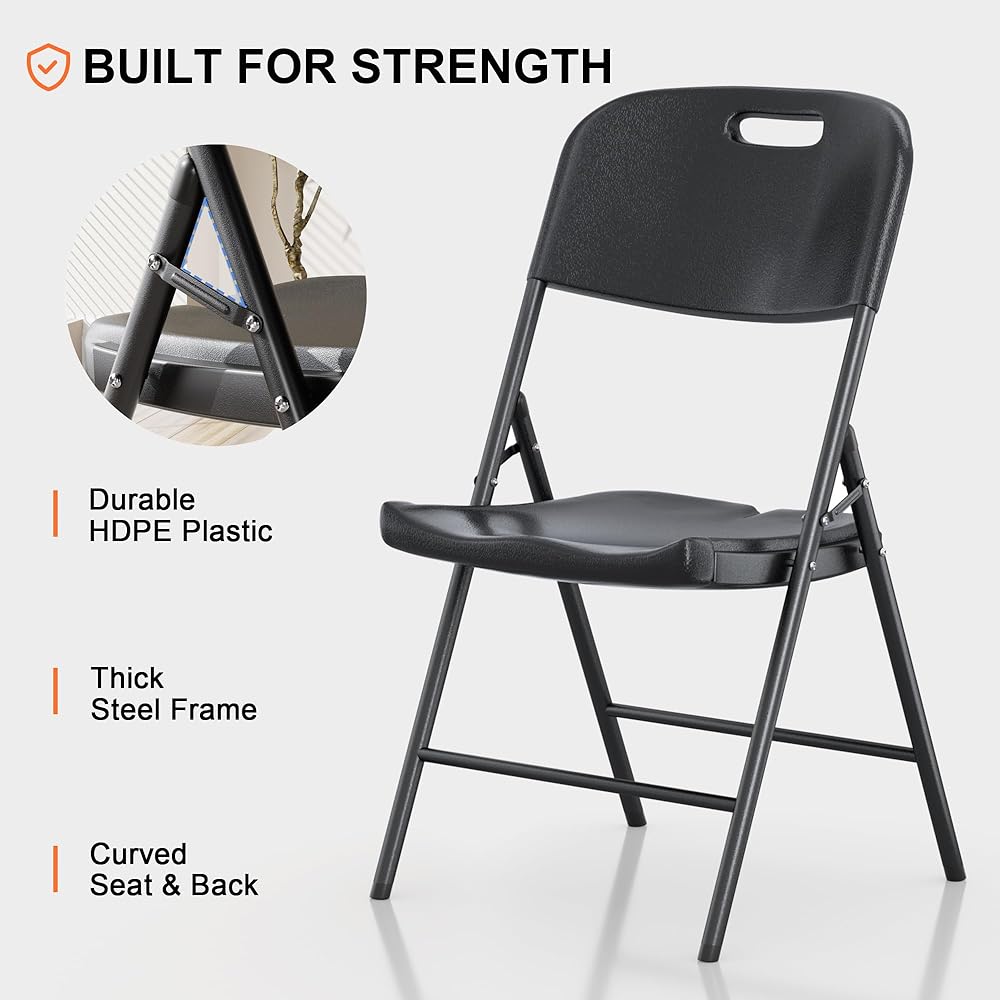 Ergonomic Comfort: Designed with ergonomics in mind, the folding chair features a curved seat and backrest that cradle the body, offering optimal support. The matte black surface is easy to clean, while its breathable construction allows for comfort even during extended periods of sitting.