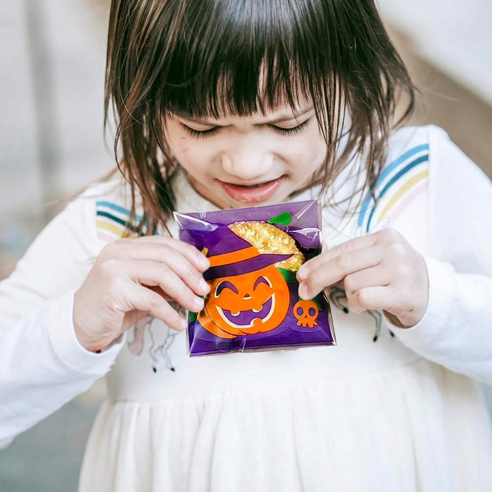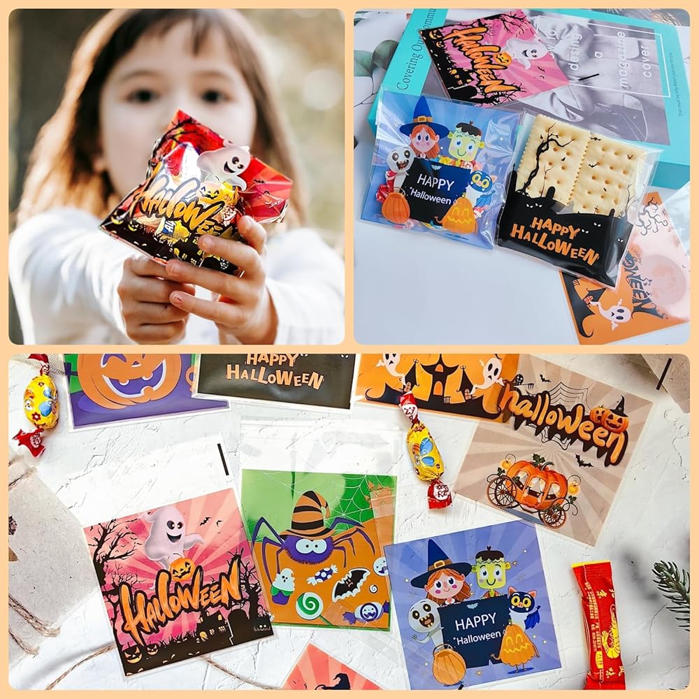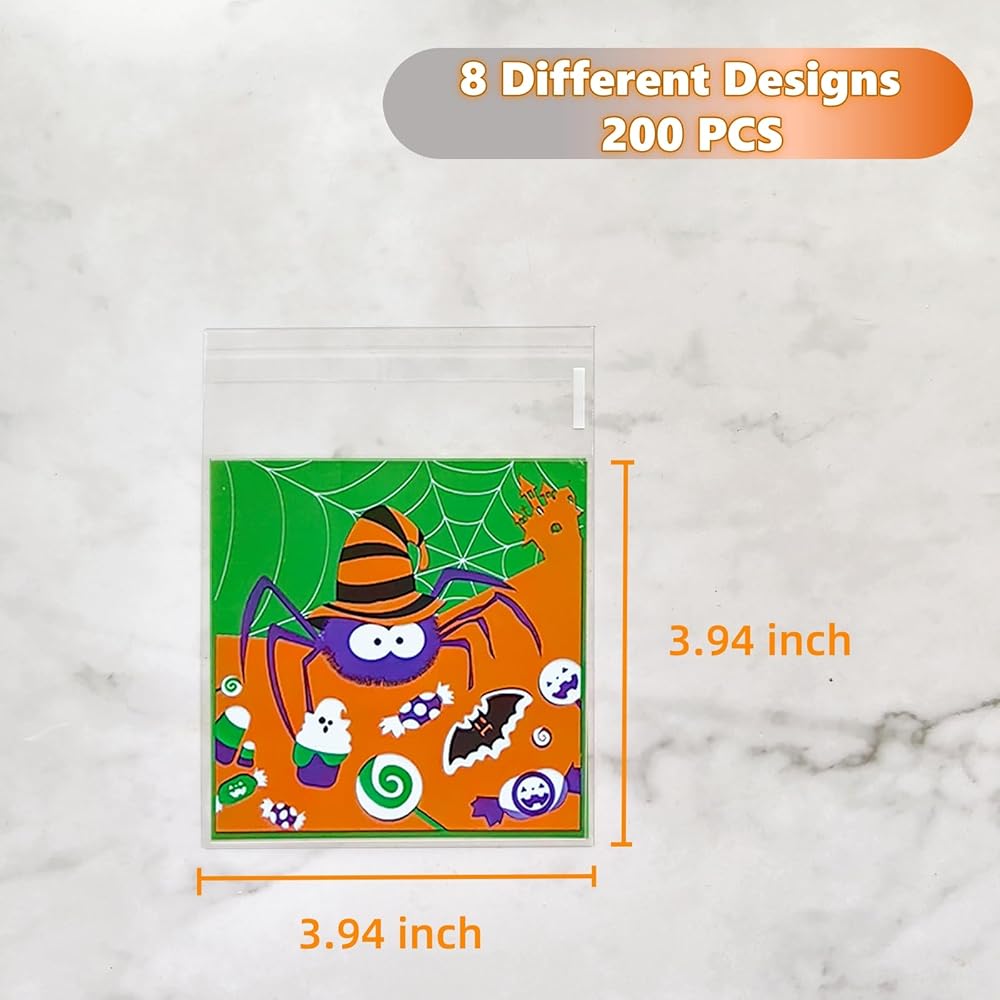 【 تصميمات متنوعة】تتضمن 8 أنماط مختلفة للهالوين، إجمالي 200 كيس بسكويت ذاتي اللصق للهالوين في العبوة. رائعة لتخزين المصاصات والمكسرات والبسكويت والمكافآت وجوائز الحلوى والشوكولاتة والكعك والتوت والوجبات الخفيفة الأخرى مع الختم.
